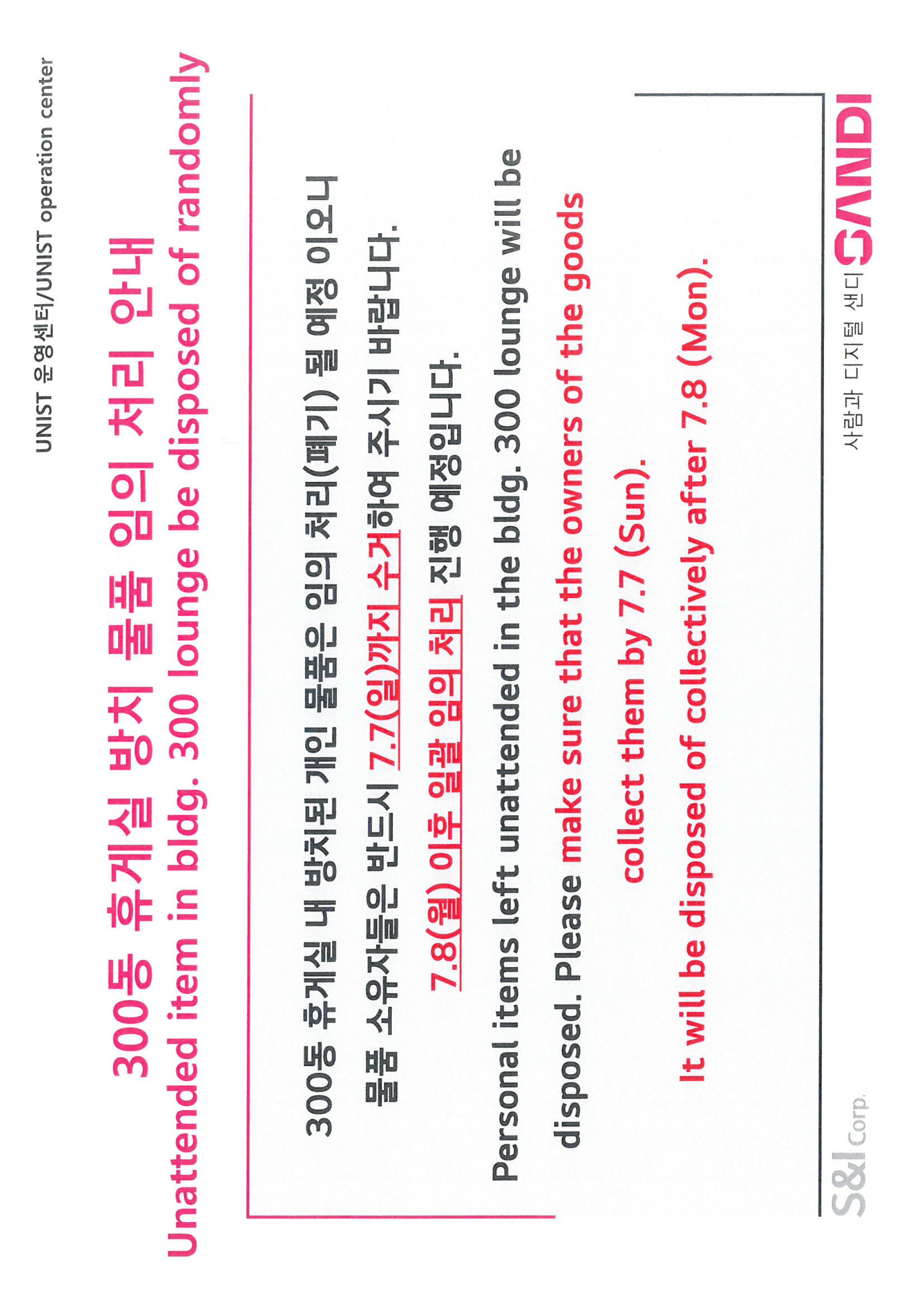 | 920 | 300동 휴게실 방치물품 임의 처리 안내/ Unattended item in.. | 2024-06-20 | 958 |