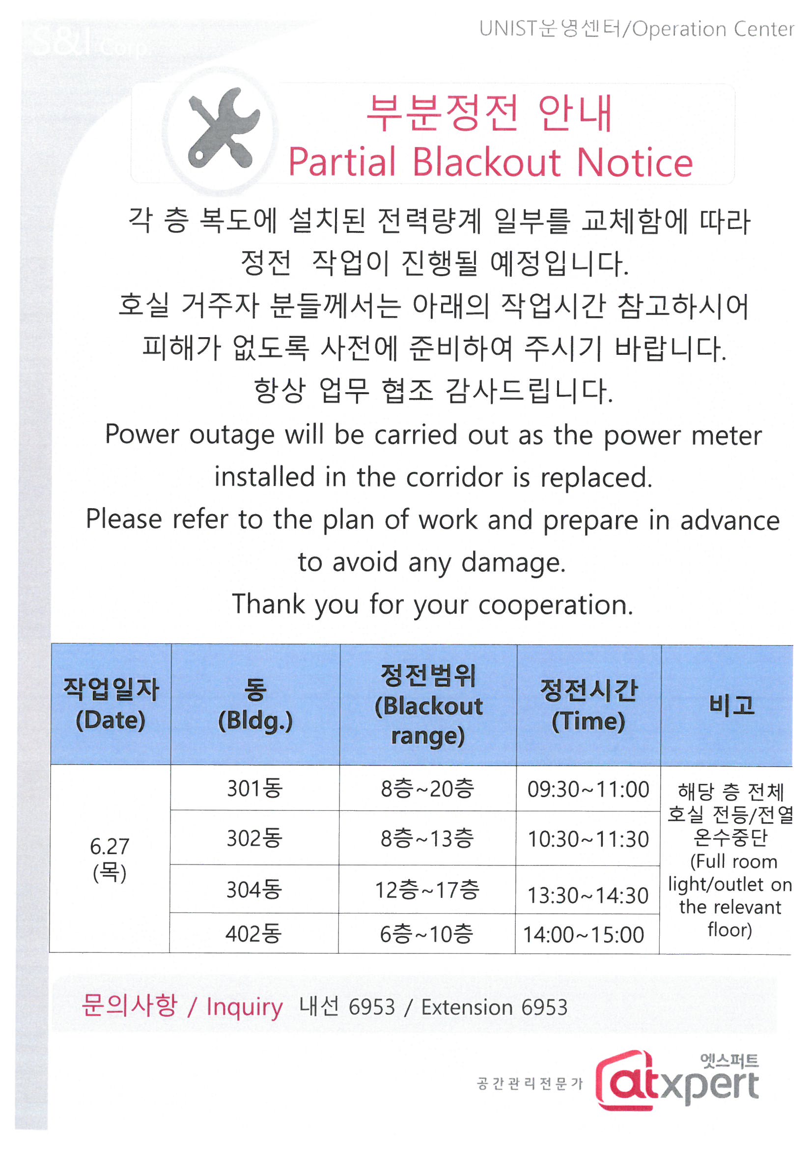 | 921 | 부분 정전 안내/ Partial Blackout notice | 2024-06-20 | 839 |