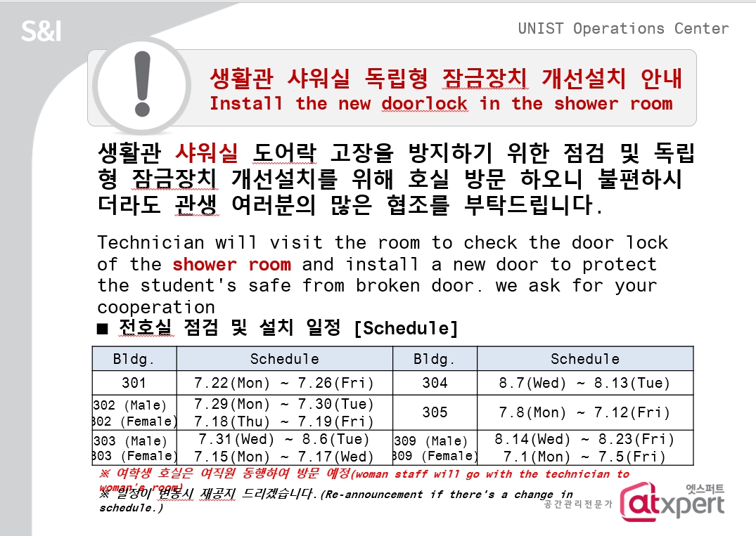 | 922 | 생활관 샤워실 독립형 잠금장치 개선설치 안내/Install the .. | 2024-06-26 | 1001 |