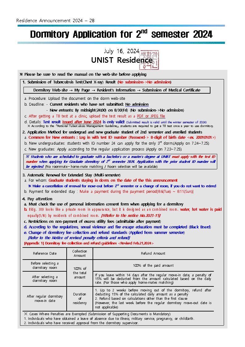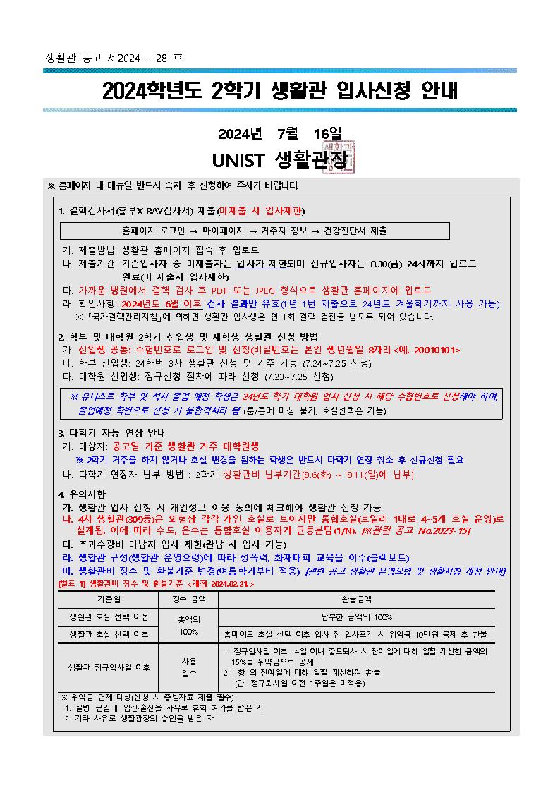 | 923 | 2024학년도 여름학기 중도 퇴사 절차 안내/Move out process.. | 2024-06-28 | 1715 |