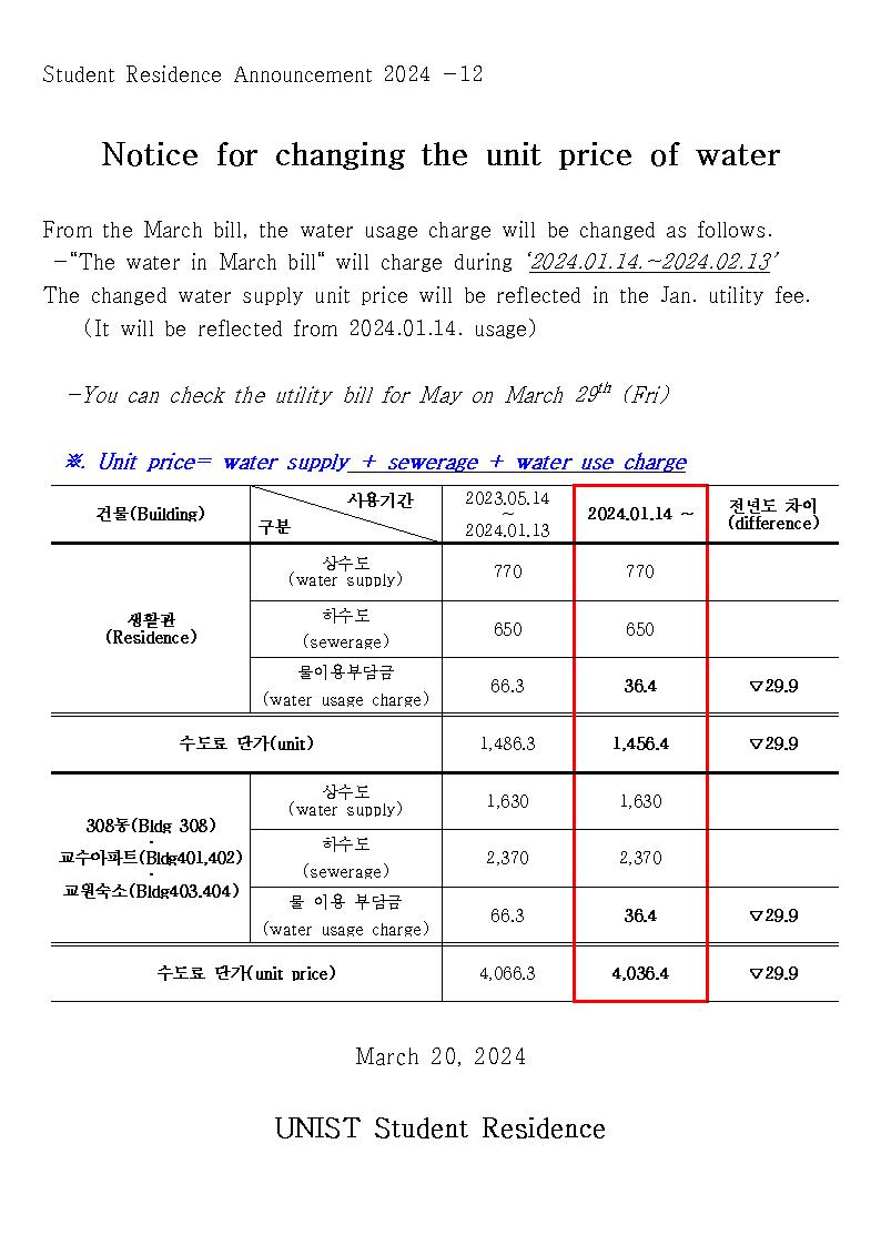 | 893 | [No.2024-12] 2024년 생활관 수도료 단가 변경 안내(Notice .. | 2024-03-20 | 1066 |