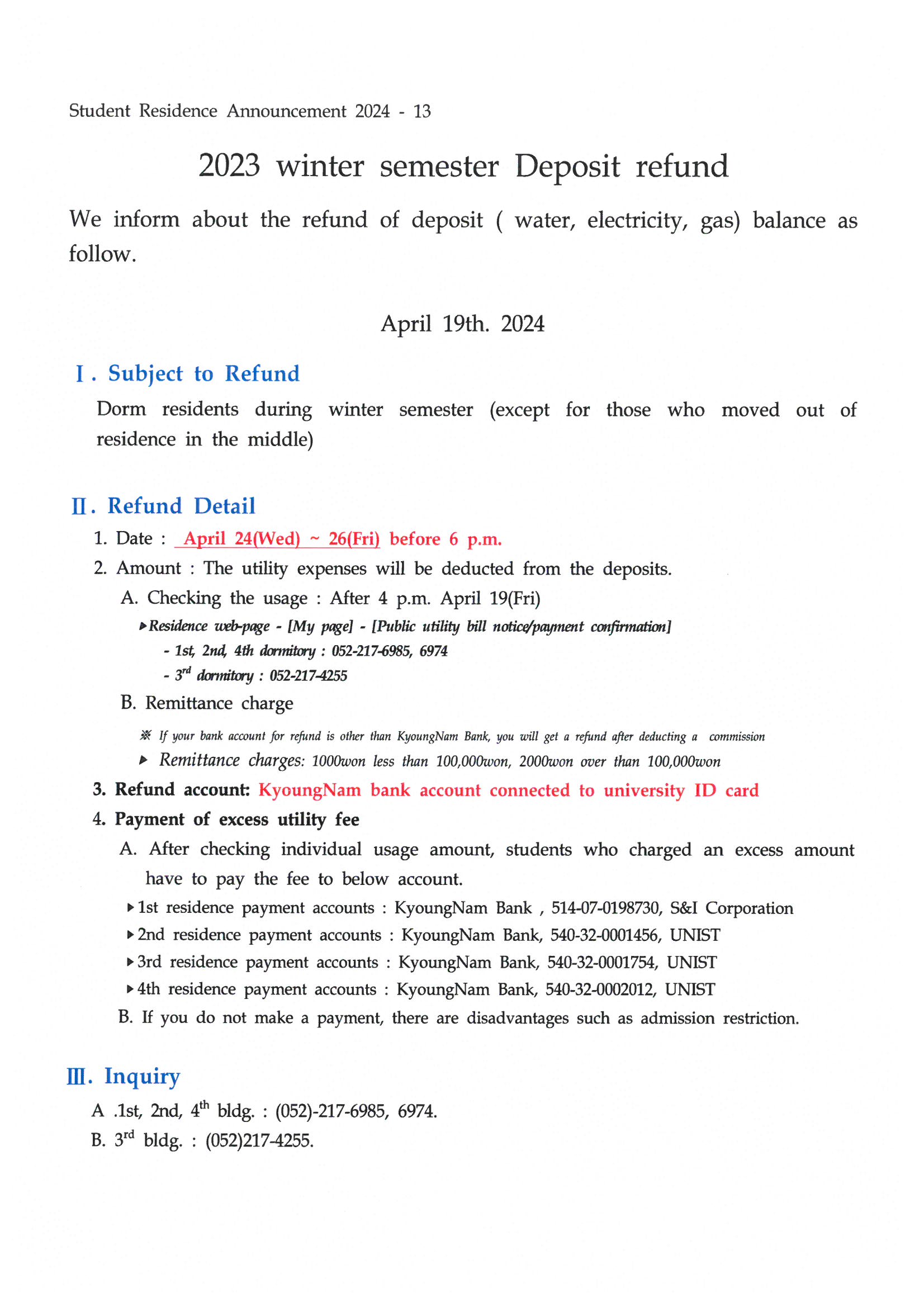 | 897 | [No.2024-13] 2023년 겨울학기 예치금 잔액환불 안내(Notice.. | 2024-04-19 | 1426 |