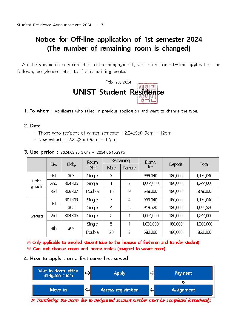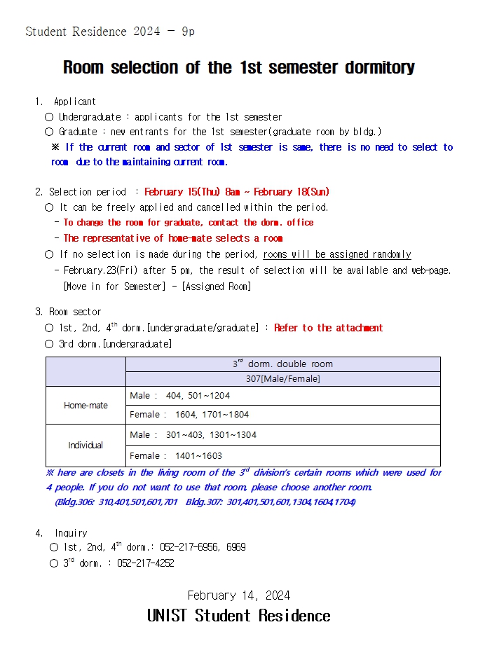 | 872 | [No.2024-6] 2024년 1학기 대학원 룸메이트 신청 안내 | 2024-02-07 | 1361 |