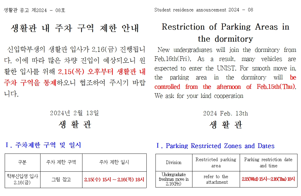 | 876 | [No.2024-08]생활관 주차 구역 제한 안내 (Restriction of P.. | 2024-02-13 | 1289 |