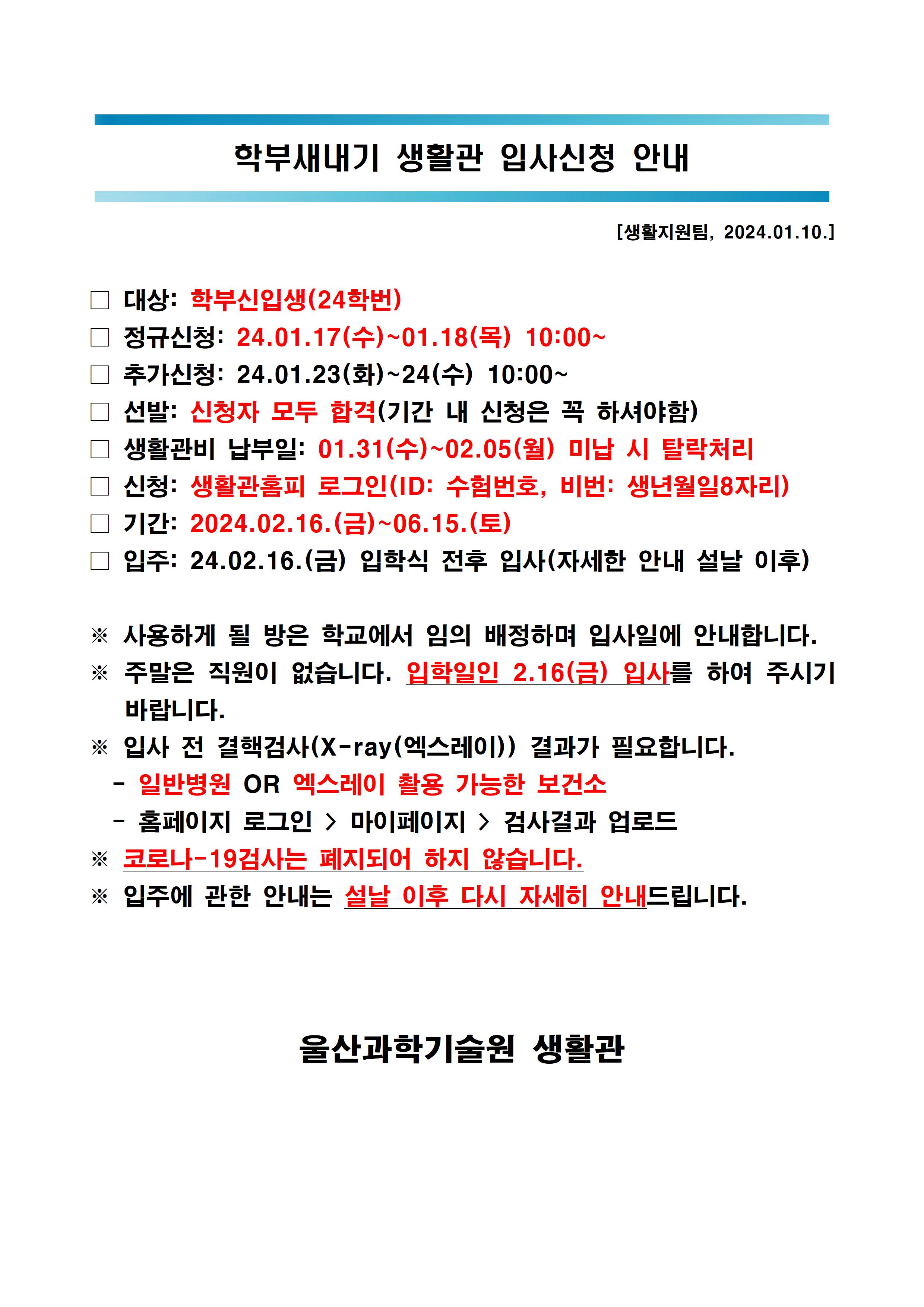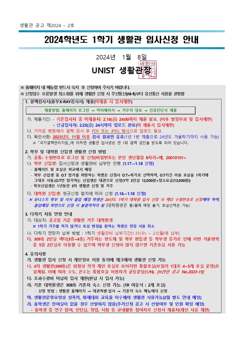 | 859 | (No.2024-02) 2024학년도 1학기 생활관 입사신청 안내(Notic.. | 2024-01-08 | 13630 |
