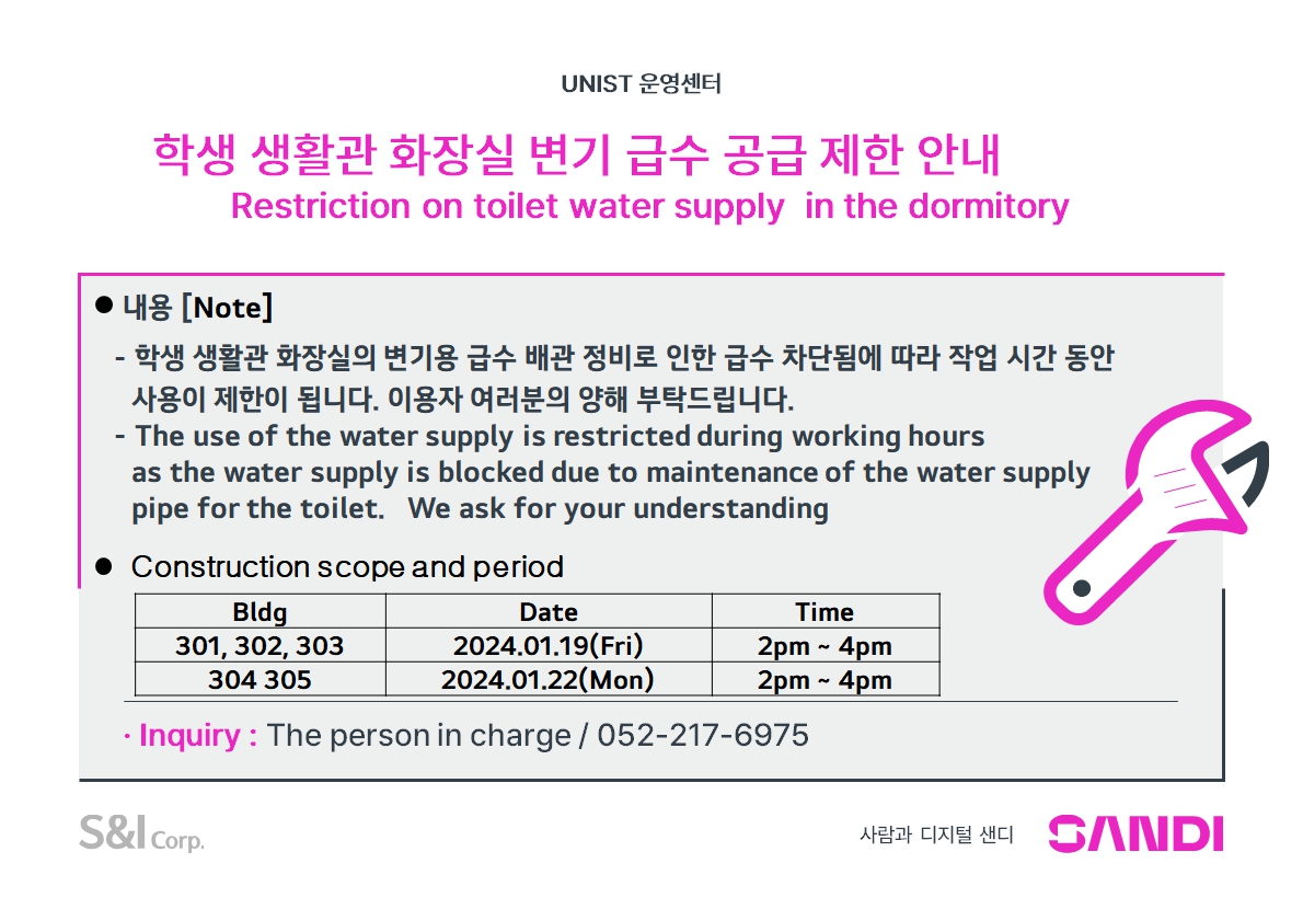 | 861 | 1,2차 생활관 화장실 변기 급수 공급 제한 안내(Restriction.. | 2024-01-16 | 1145 |