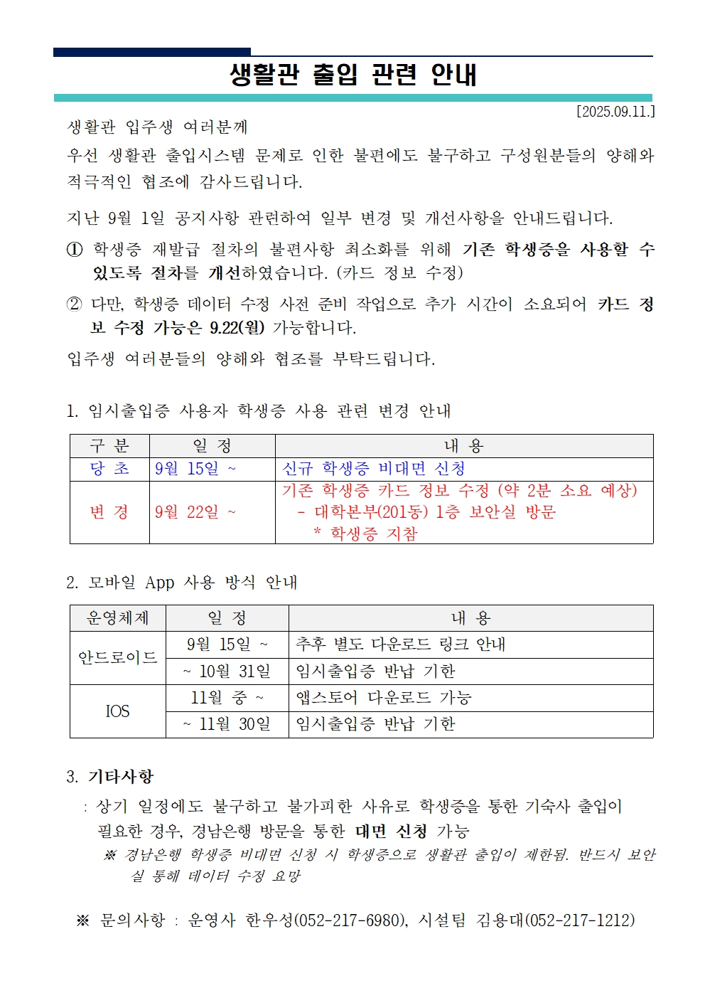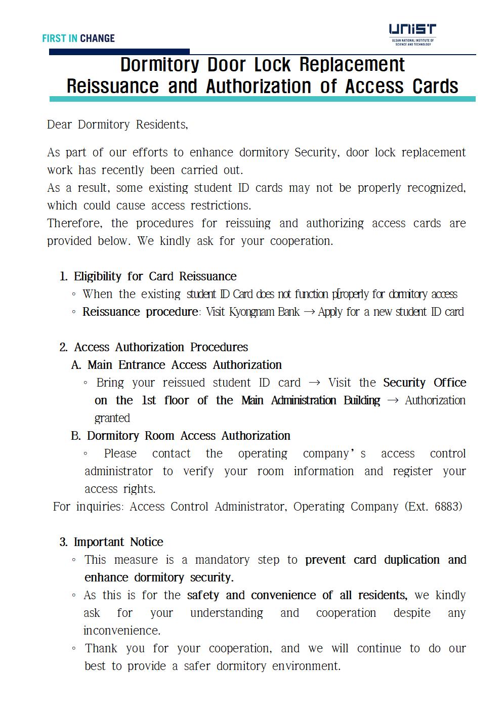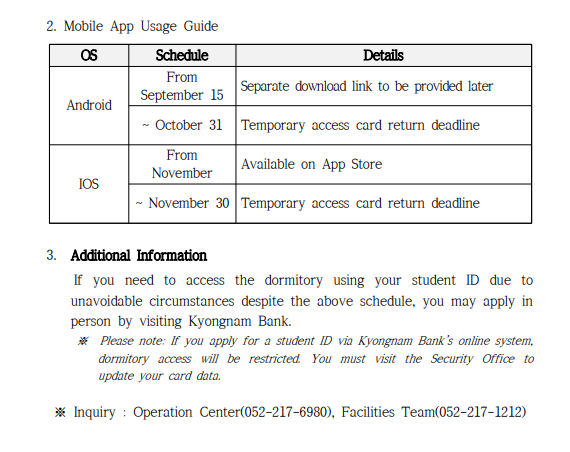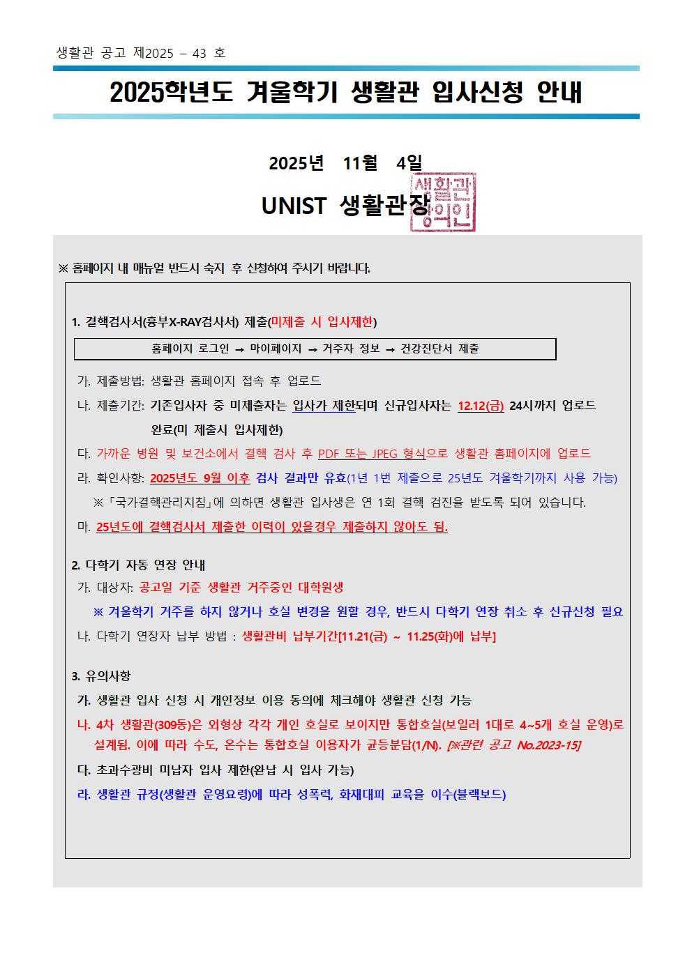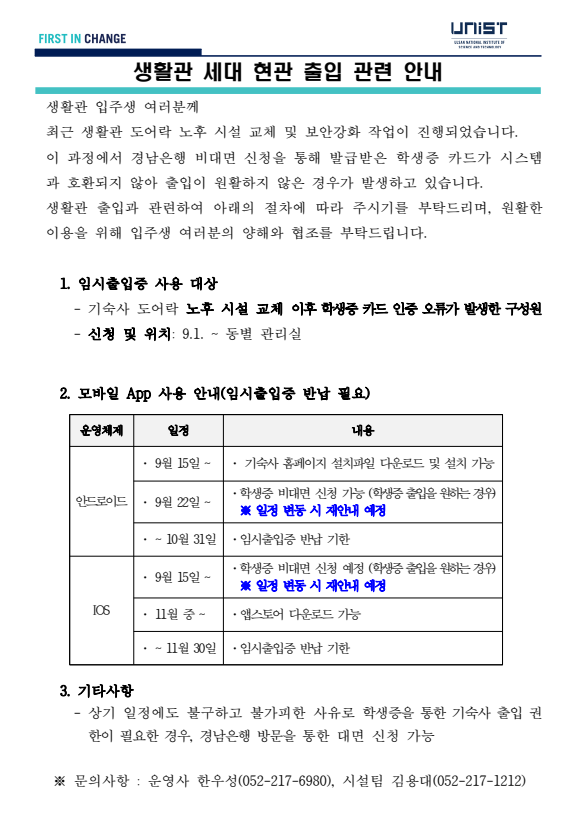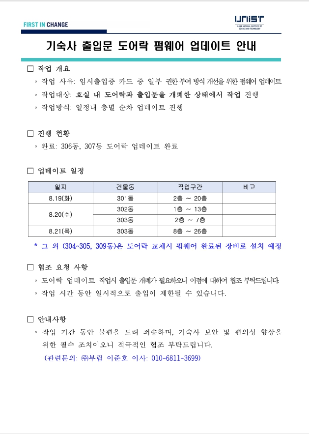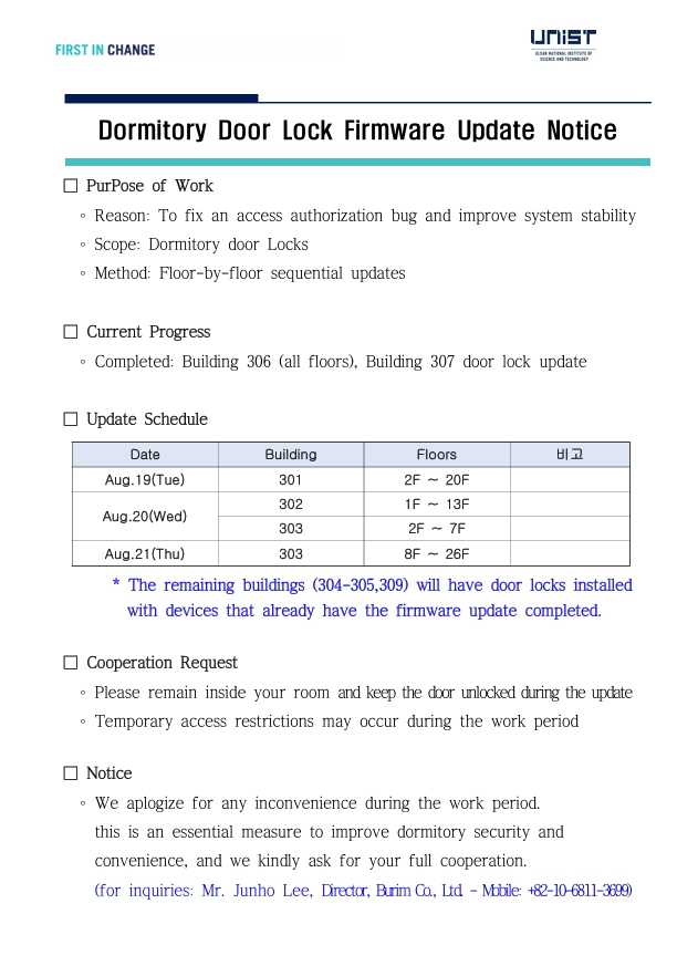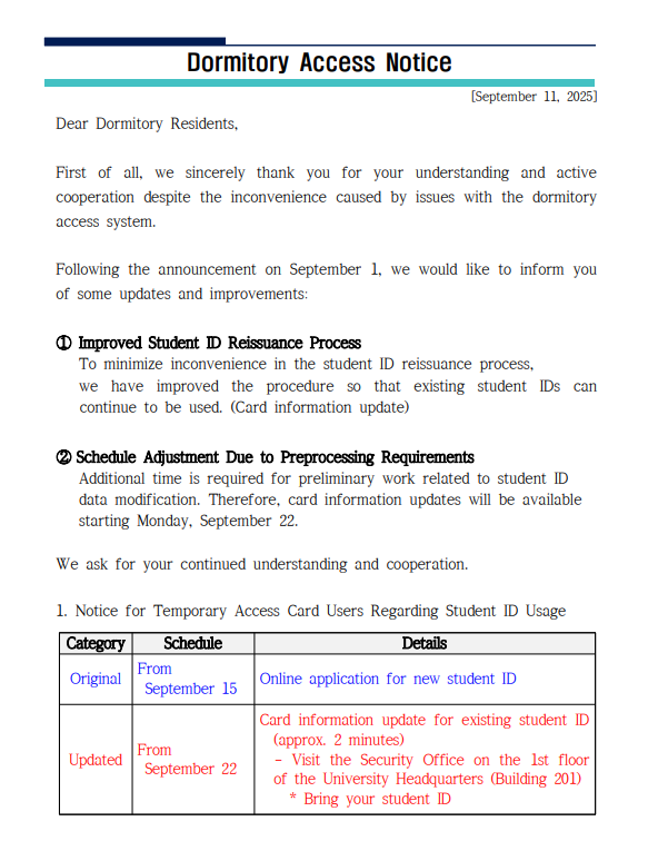 | 공지 | 생활관 도어락 교체에 따른 출입카드 재발급 안내(Dormitory.. | 2025-08-27 | 1048 |
