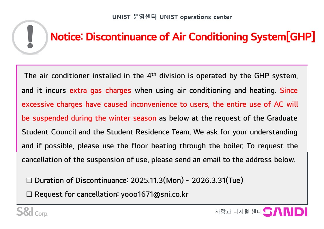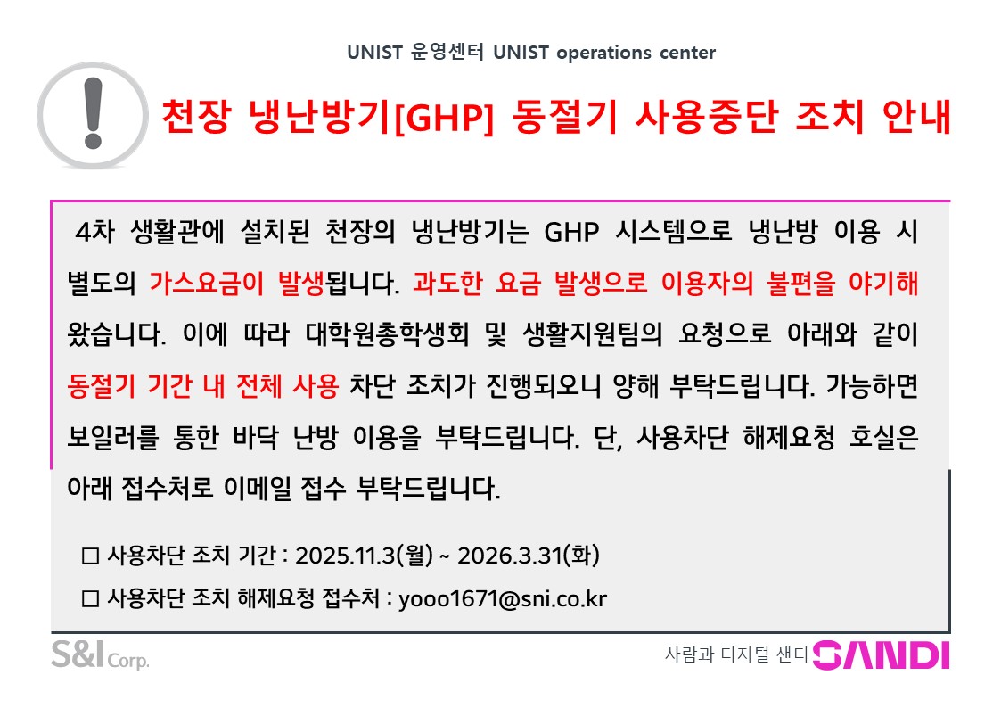 | 공지 | 천장 냉난방기[GHP] 동절기 사용중단 조치 안내/ Discontinu.. | 2025-10-31 | 361 |
