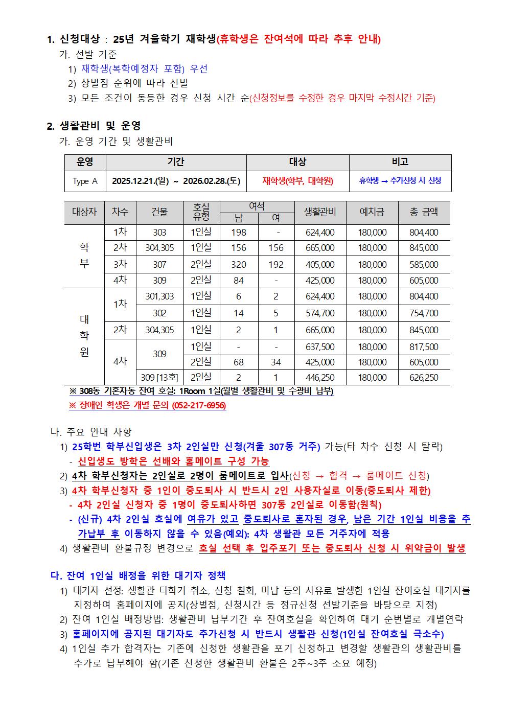 | 공지 | (수정)[No.2025-43] 2025학년도 겨울학기 생활관 입사신청 .. | 2025-11-04 | 5974 |