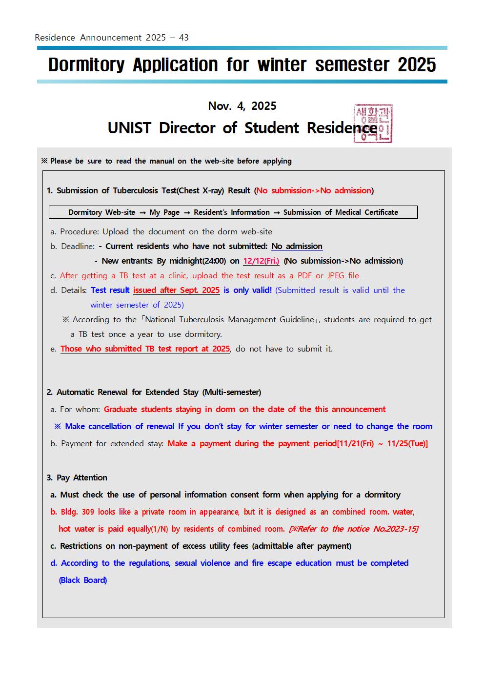 | 공지 | Notice for Dormitory Extension Application for the Fall .. | 2025-11-25 | 360 | |