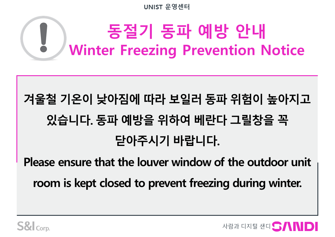 | 공지 | 동절기 동파 예방 안내 (Winter Freezing Prevention Notice.. | 2025-11-18 | 216 |
