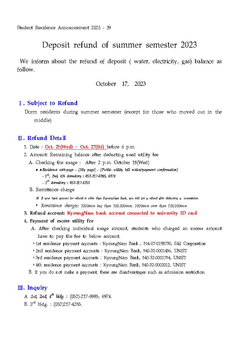 | 827 | (No.2023-39) 2023년 여름학기 예치금 잔액환불 안내(2023 S.. | 2023-10-17 | 1190 |