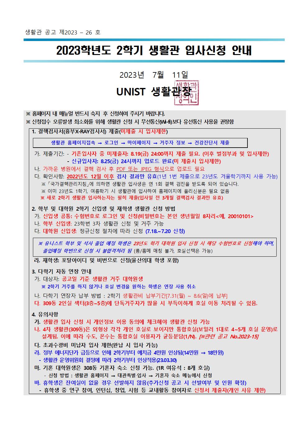 | 788 | [No.2023-26] 2023년도 2학기 생활관 입사신청 안내(Dormito.. | 2023-07-11 | 12510 |