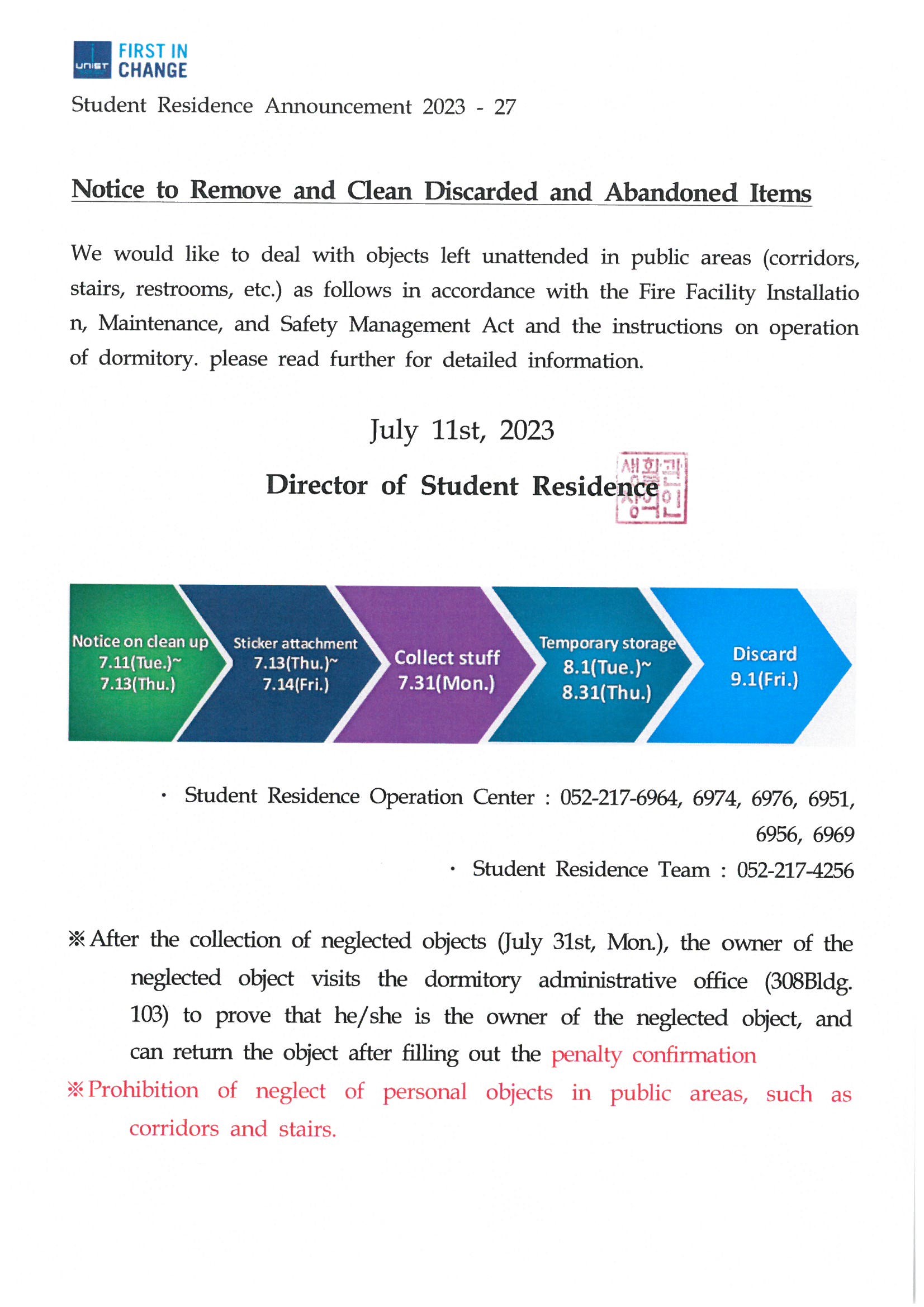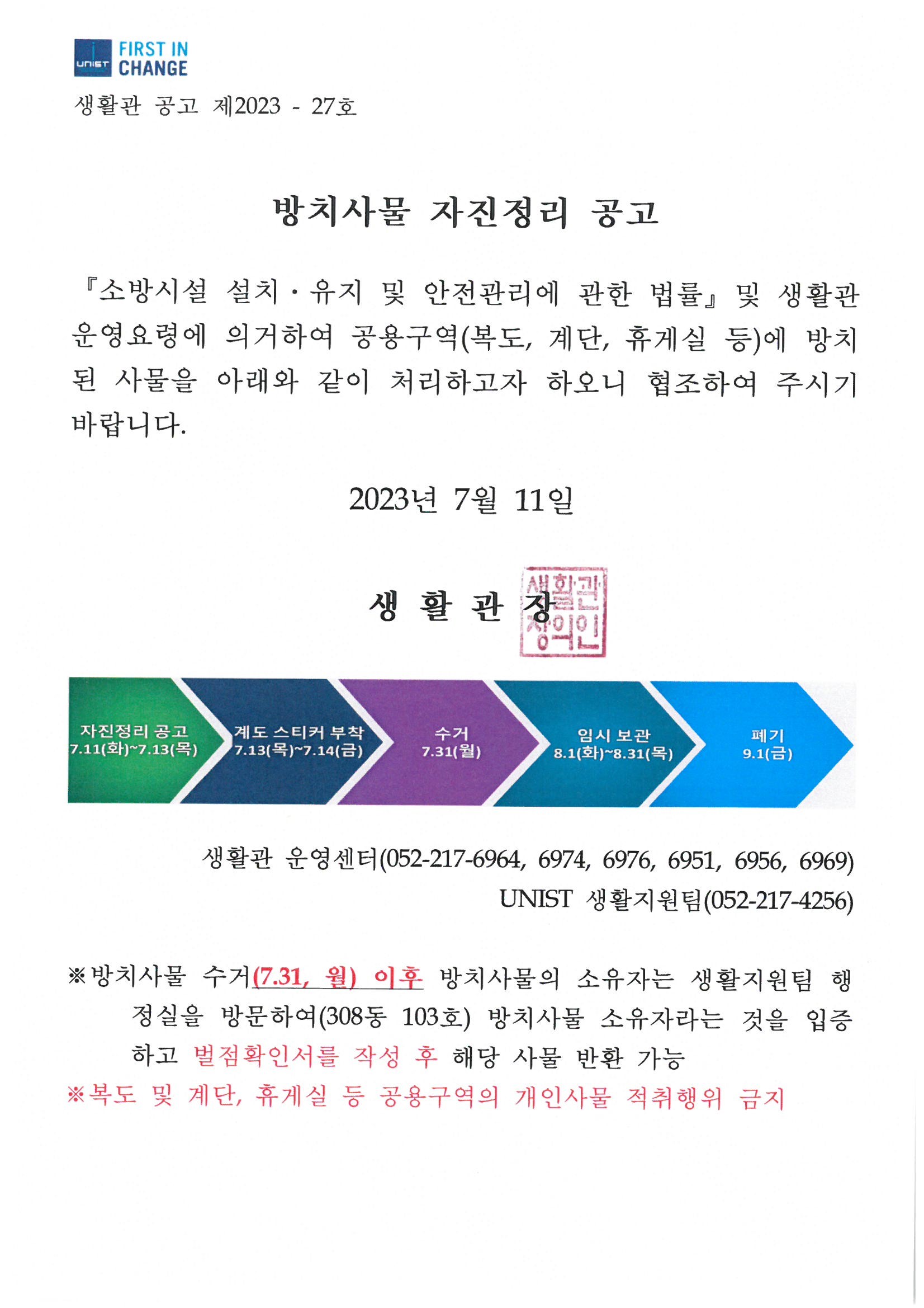| 789 | [No.2023-27] 방치사물 자진정리 공고 (Notice to Remove an.. | 2023-07-11 | 1316 |