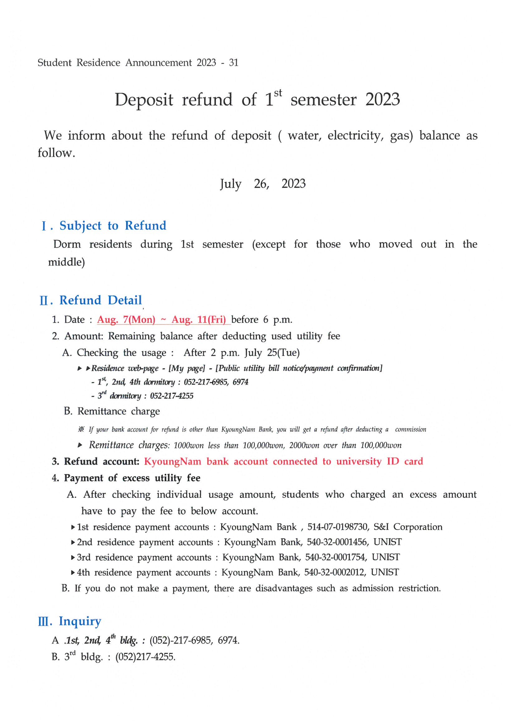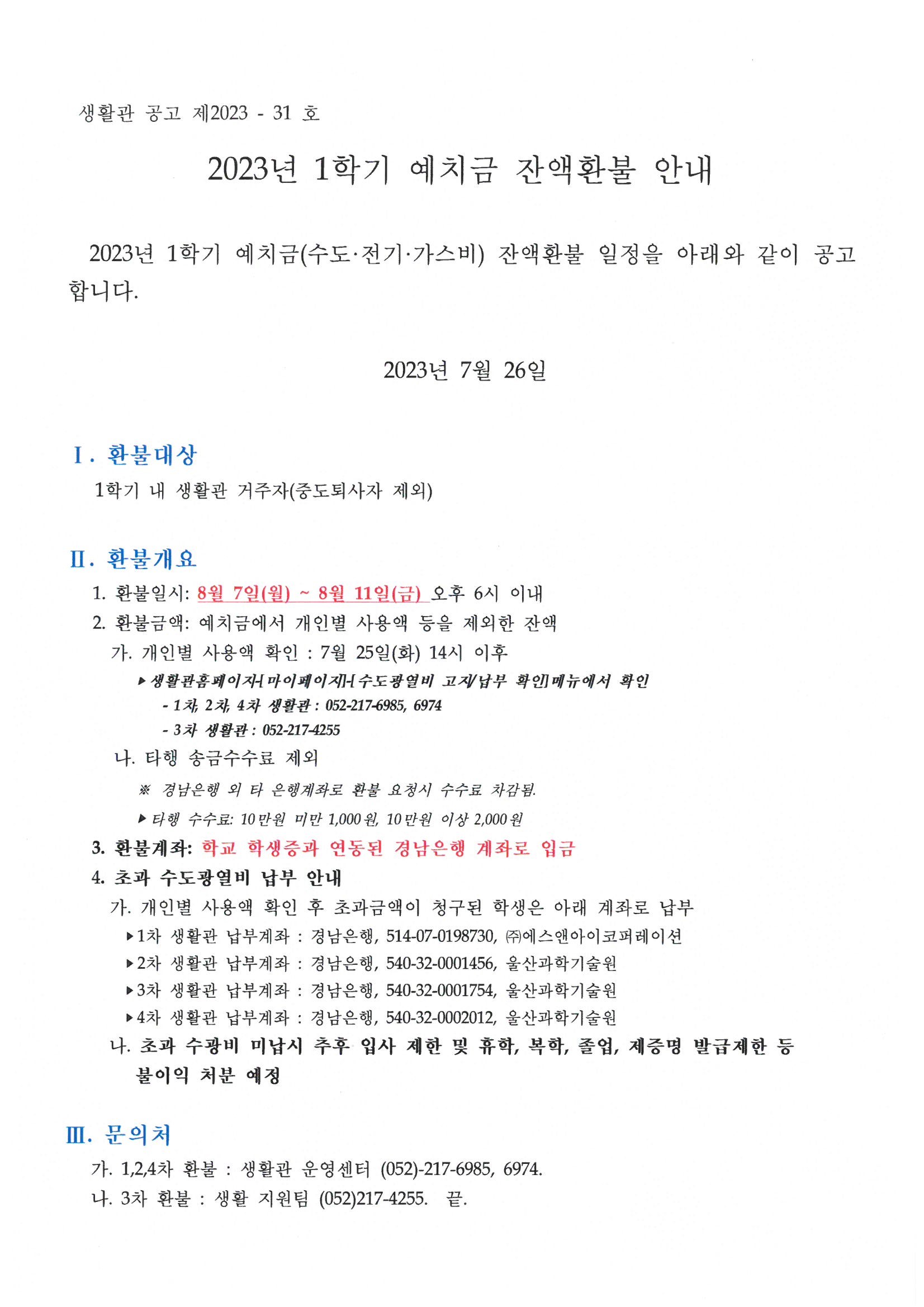| 794 | [No.2023-31] 2023년 1학기 예치금 잔액환불 안내 (Deposit .. | 2023-07-26 | 2386 |