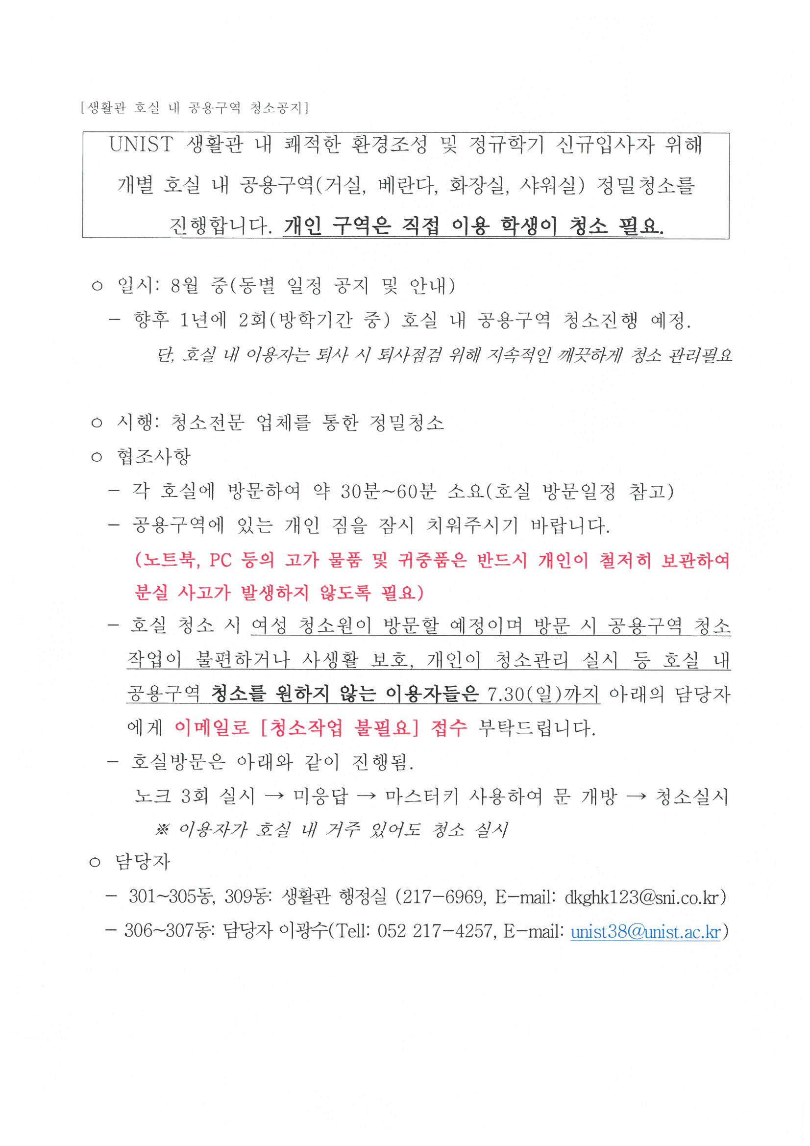 | 796 | (일정수정) 생활관 호실 내 공용구역 청소공지 (Cleaning fo.. | 2023-07-27 | 2150 |