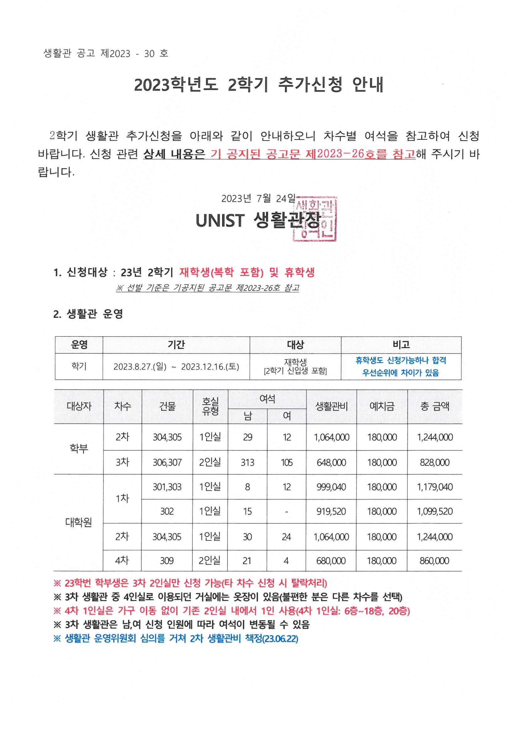 | 794 | [No.2023-30] (여석수정) 2023학년도 생활관 2학기 추가신청.. | 2023-07-24 | 4380 |
