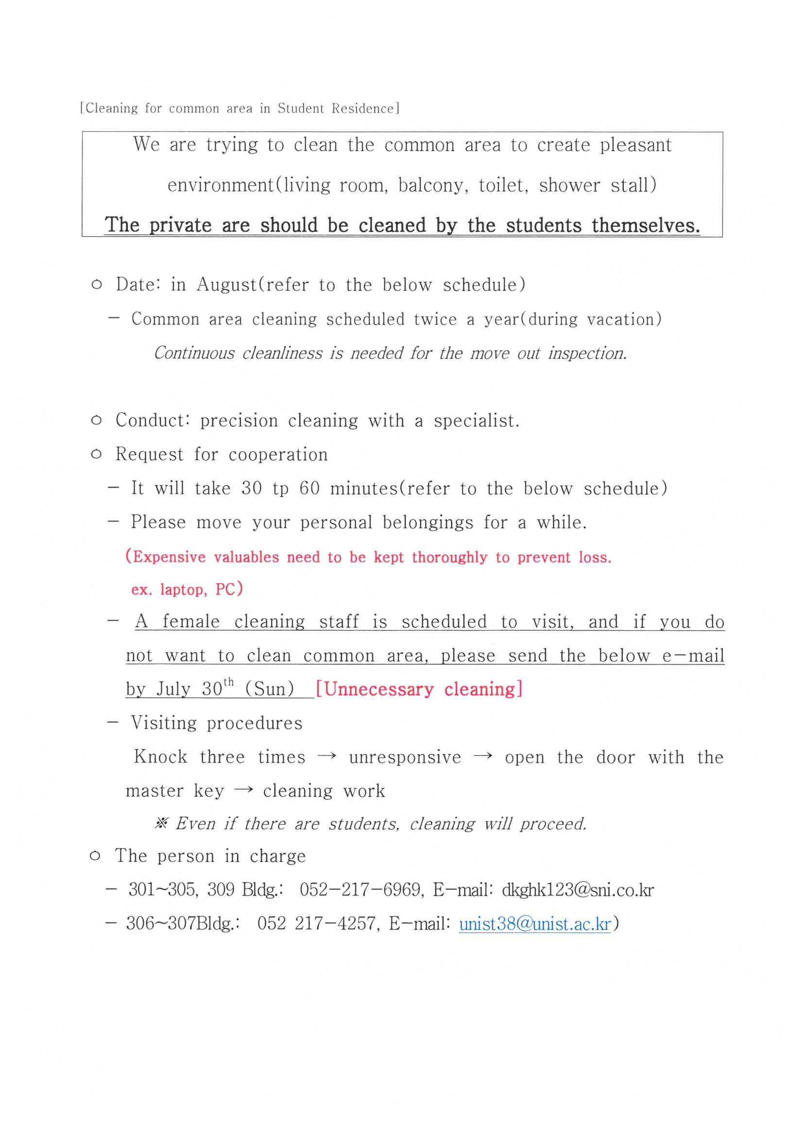 | 797 | (일정수정) 생활관 호실 내 공용구역 청소공지 (Cleaning fo.. | 2023-07-27 | 2189 |