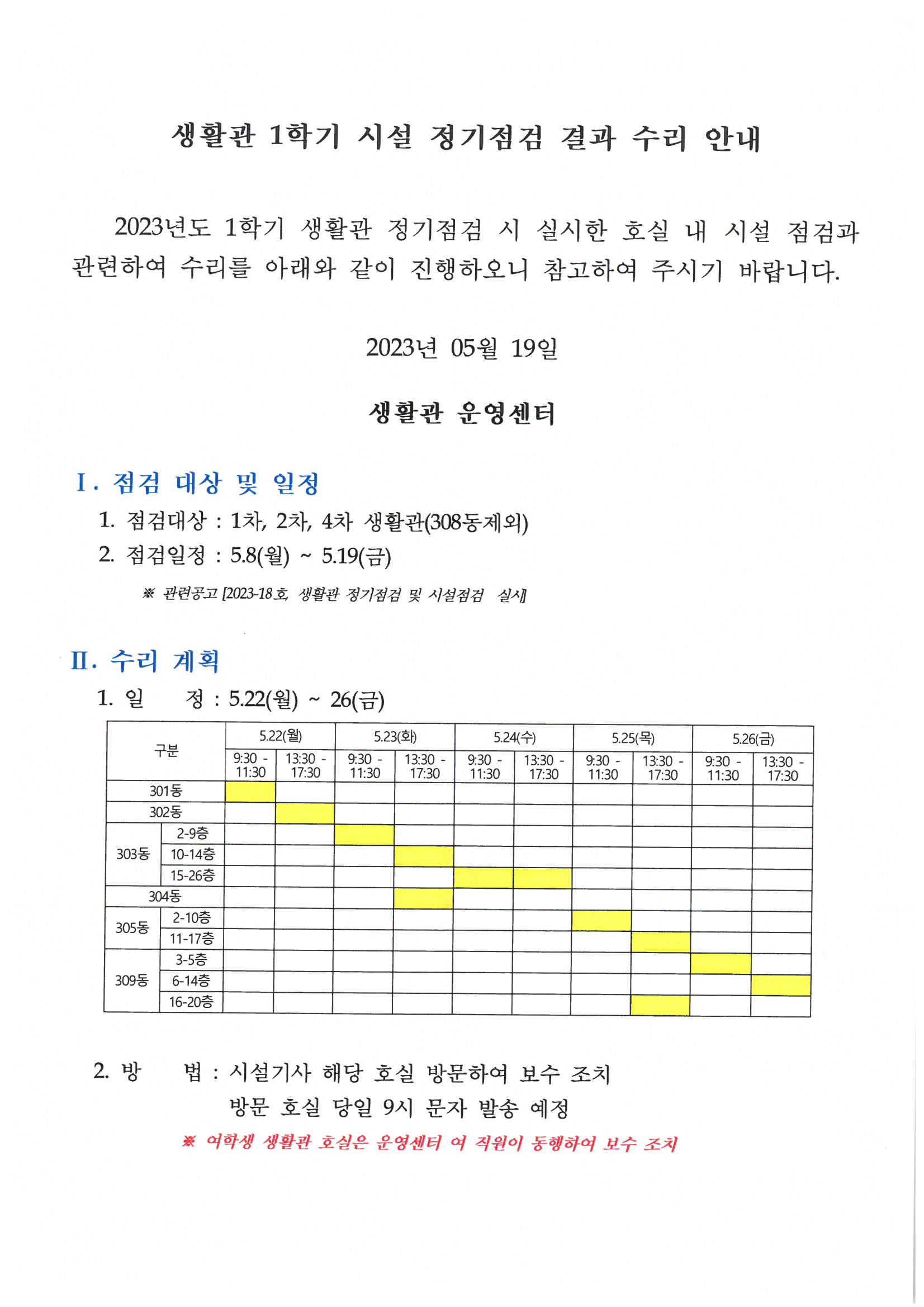 | 769 | 생활관 1학기 시설 정기점검 결과 수리 안내 (Notice for 1s.. | 2023-05-19 | 1369 |