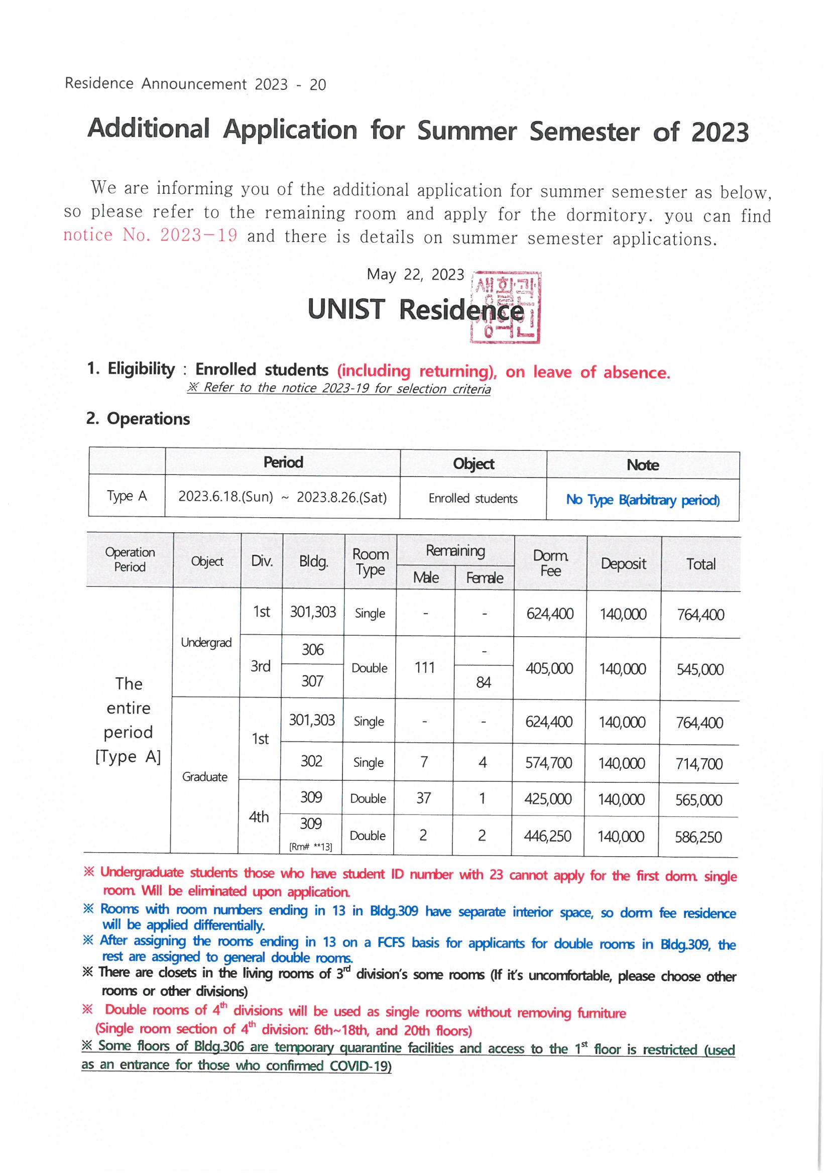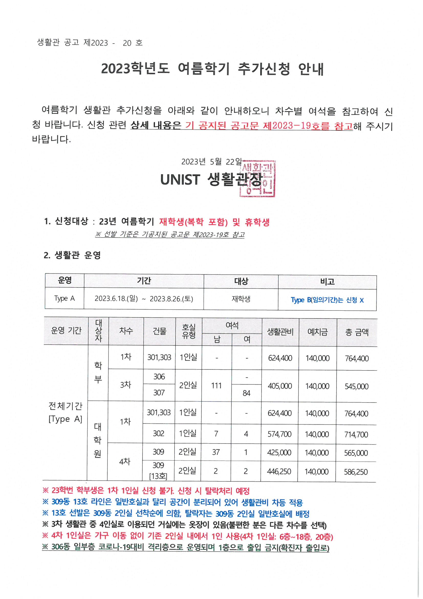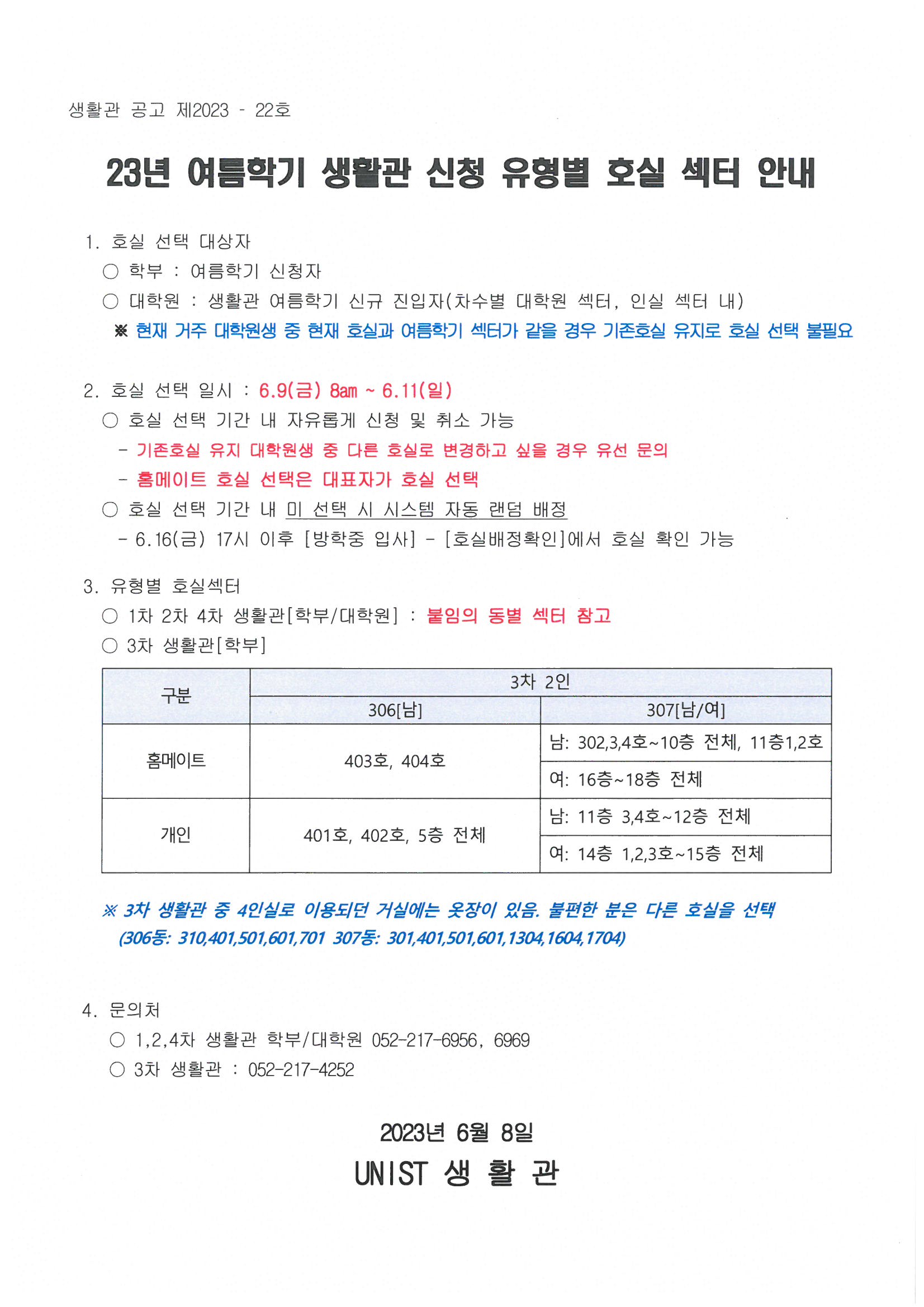 | 777 | [No.2023-22] 23년 여름학기 생활관 신청 유형별 호실 섹터 .. | 2023-06-08 | 2105 |