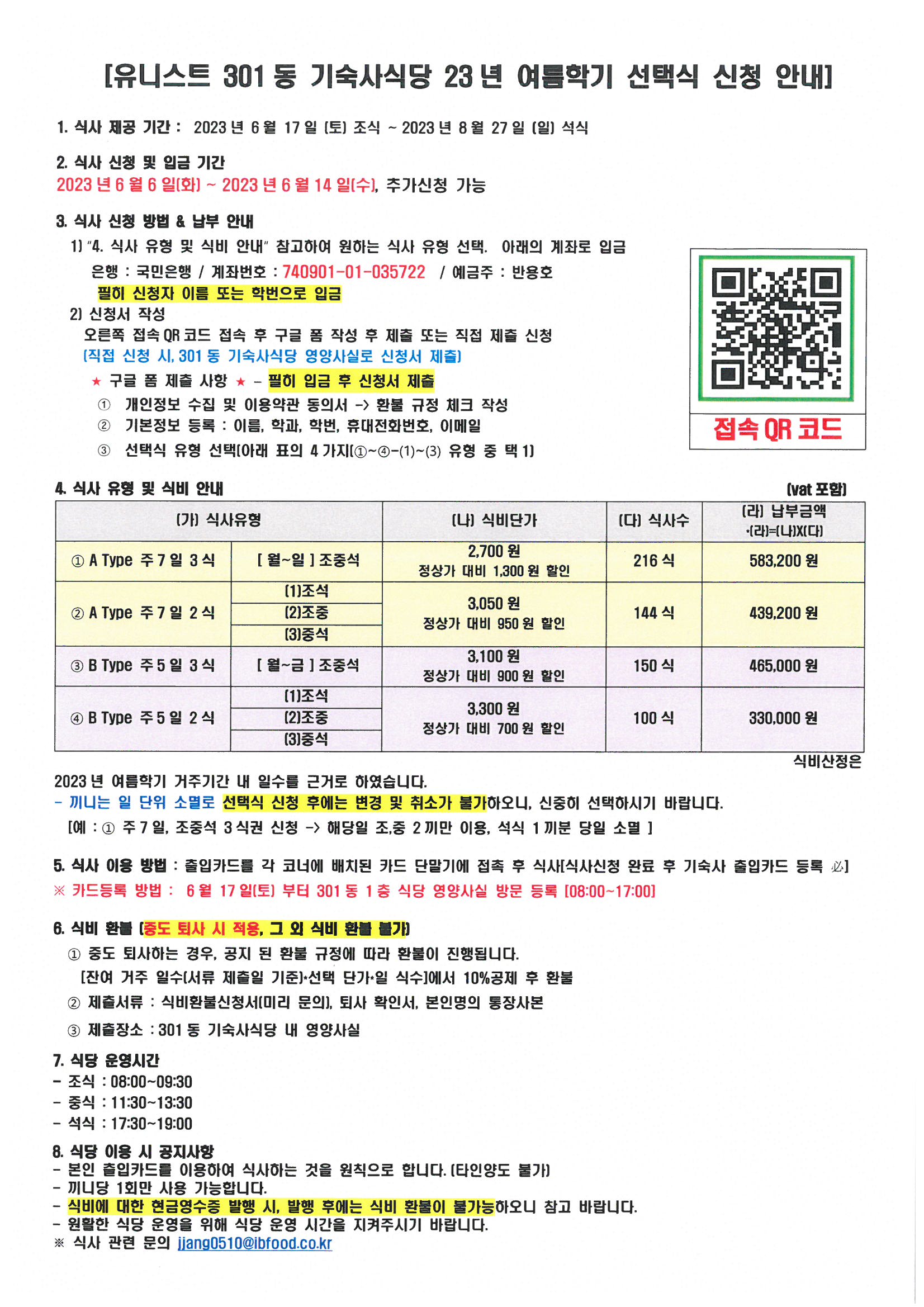 | 775 | [유니스트 301동 기숙사식당 23년 여름학기 선택식 신청 안.. | 2023-06-05 | 1612 |