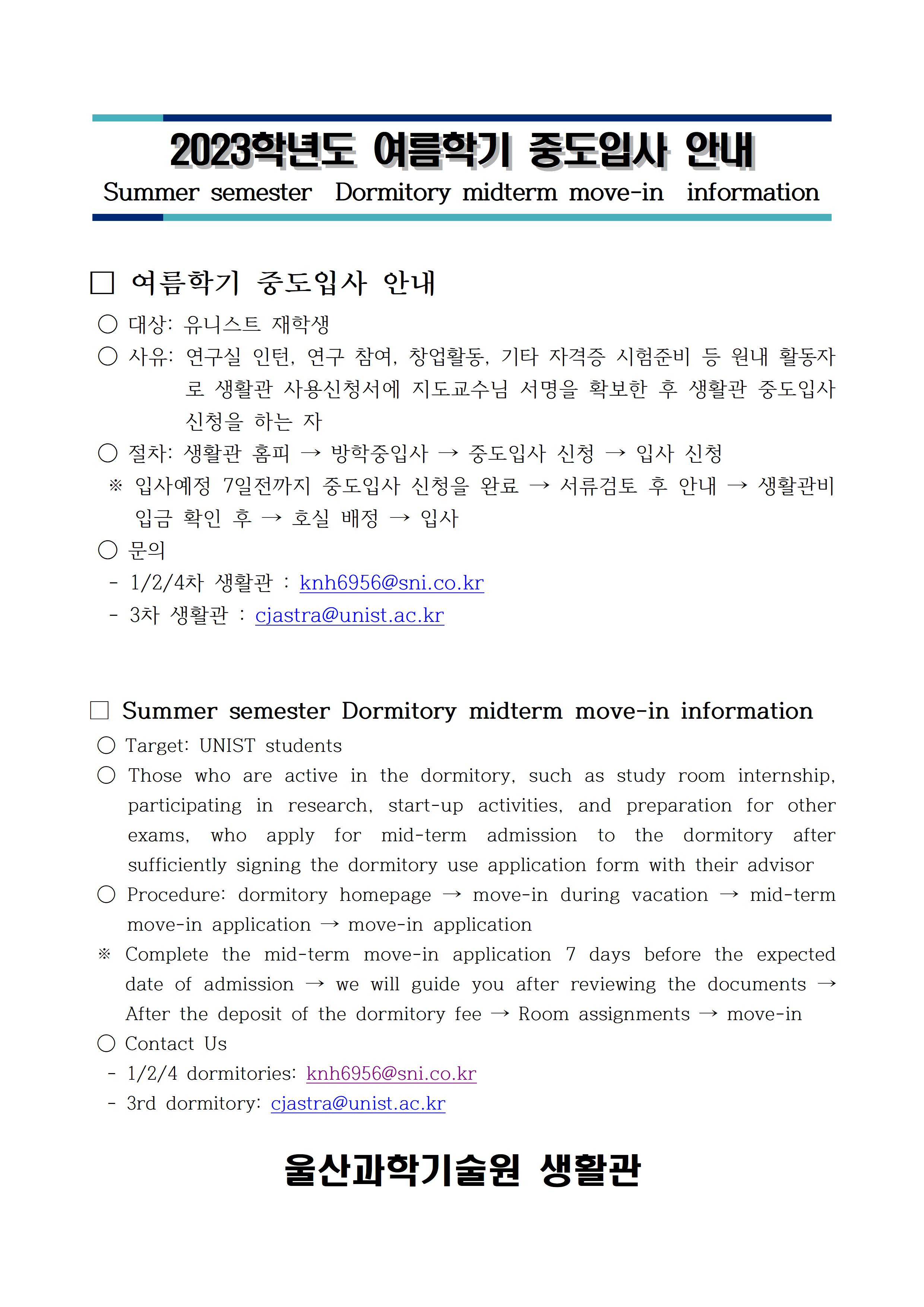 | 784 | 2023학년도 여름학기 중도퇴사 절차 안내/Move out process .. | 2023-06-21 | 2079 | |