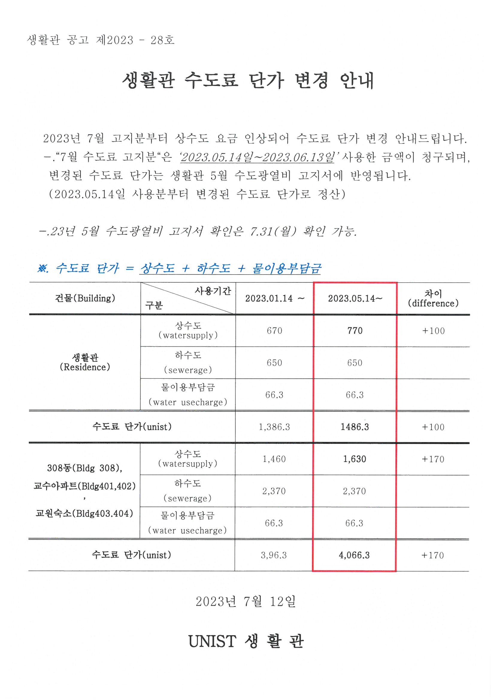 | 791 | [No.2023-28] 생활관 수도료 단가 변경 안내 (Notice for ch.. | 2023-07-12 | 1761 |