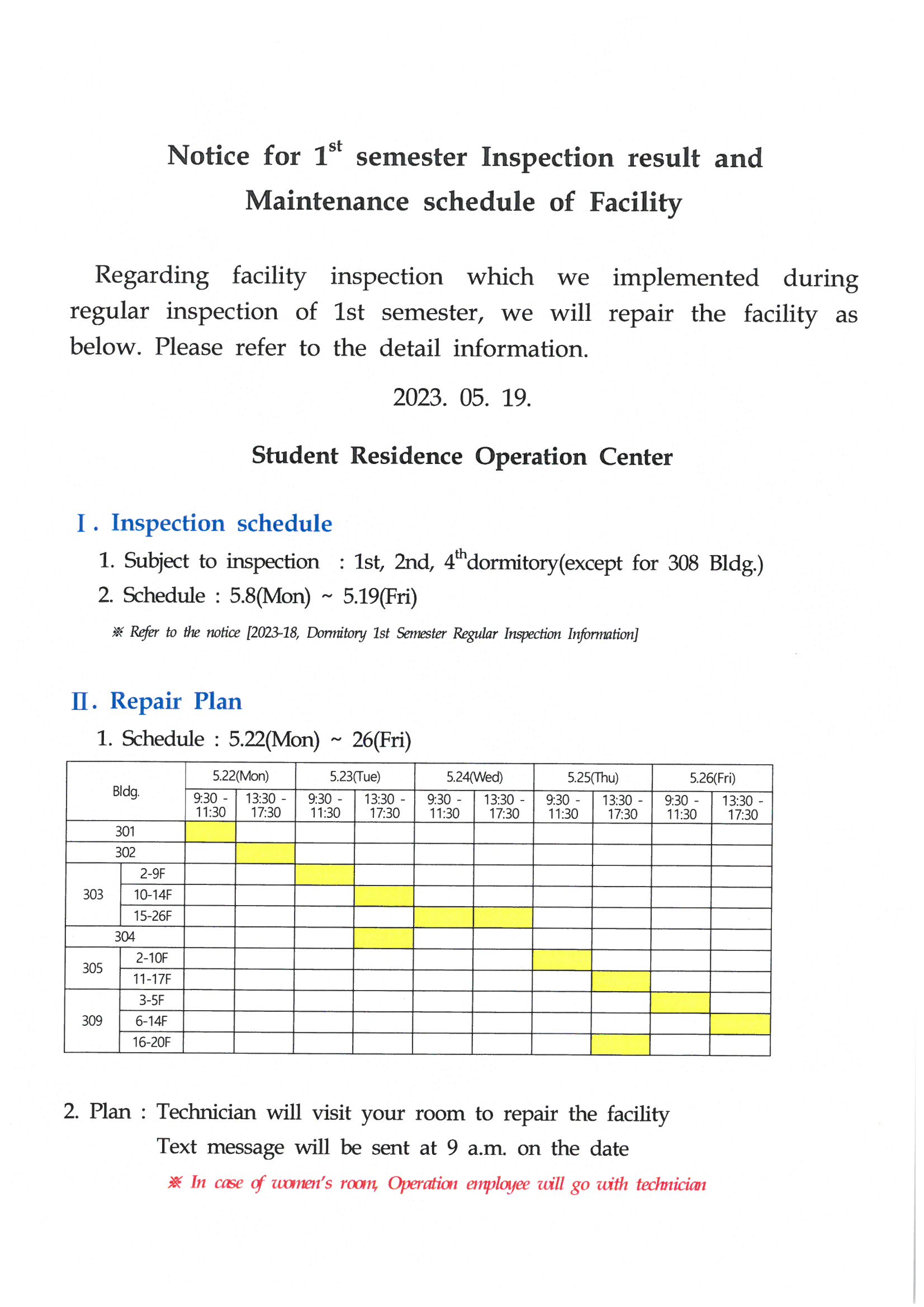 | 770 | 생활관 1학기 시설 정기점검 결과 수리 안내 (Notice for 1s.. | 2023-05-19 | 1405 |