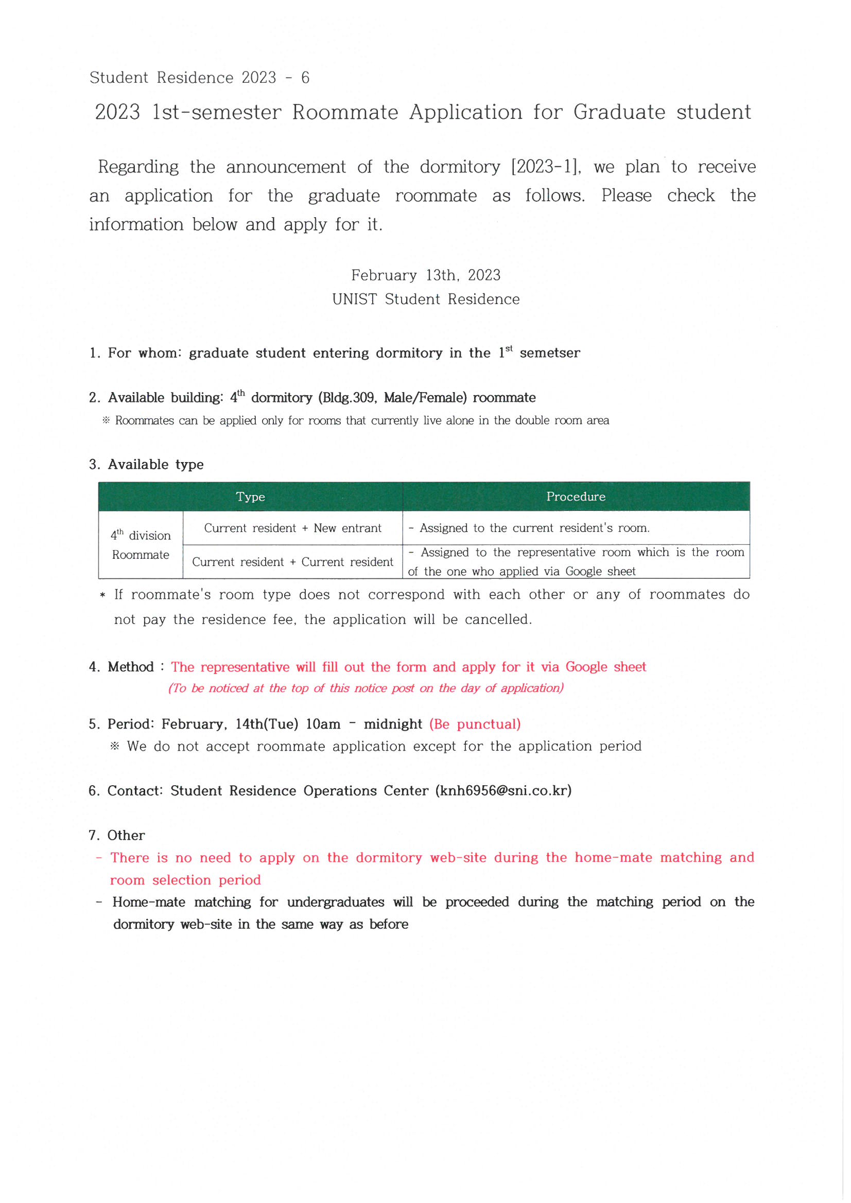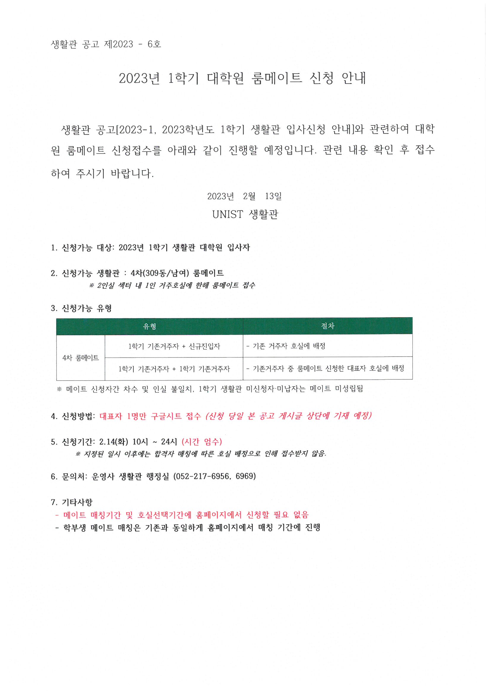 | 739 | [No.2023-6] 2023 1학기 대학원 룸메이트 신청 안내 Roommat.. | 2023-02-13 | 1853 |