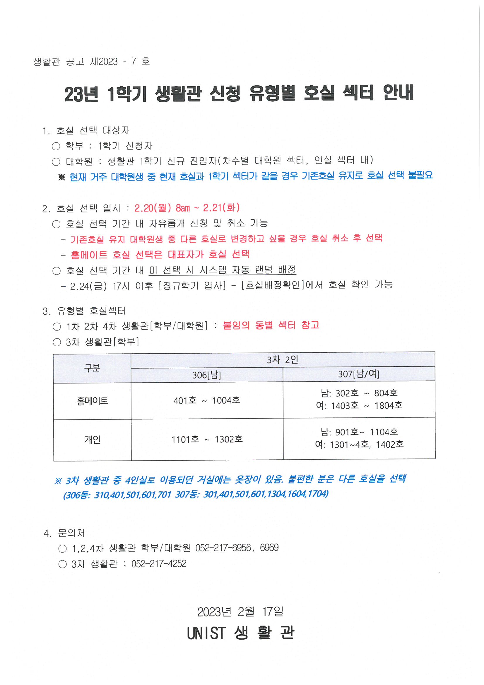| 740 | [No.2023-7] 23년 1학기 생활관 신청 유형별 호실 섹터안내 .. | 2023-02-17 | 3187 |