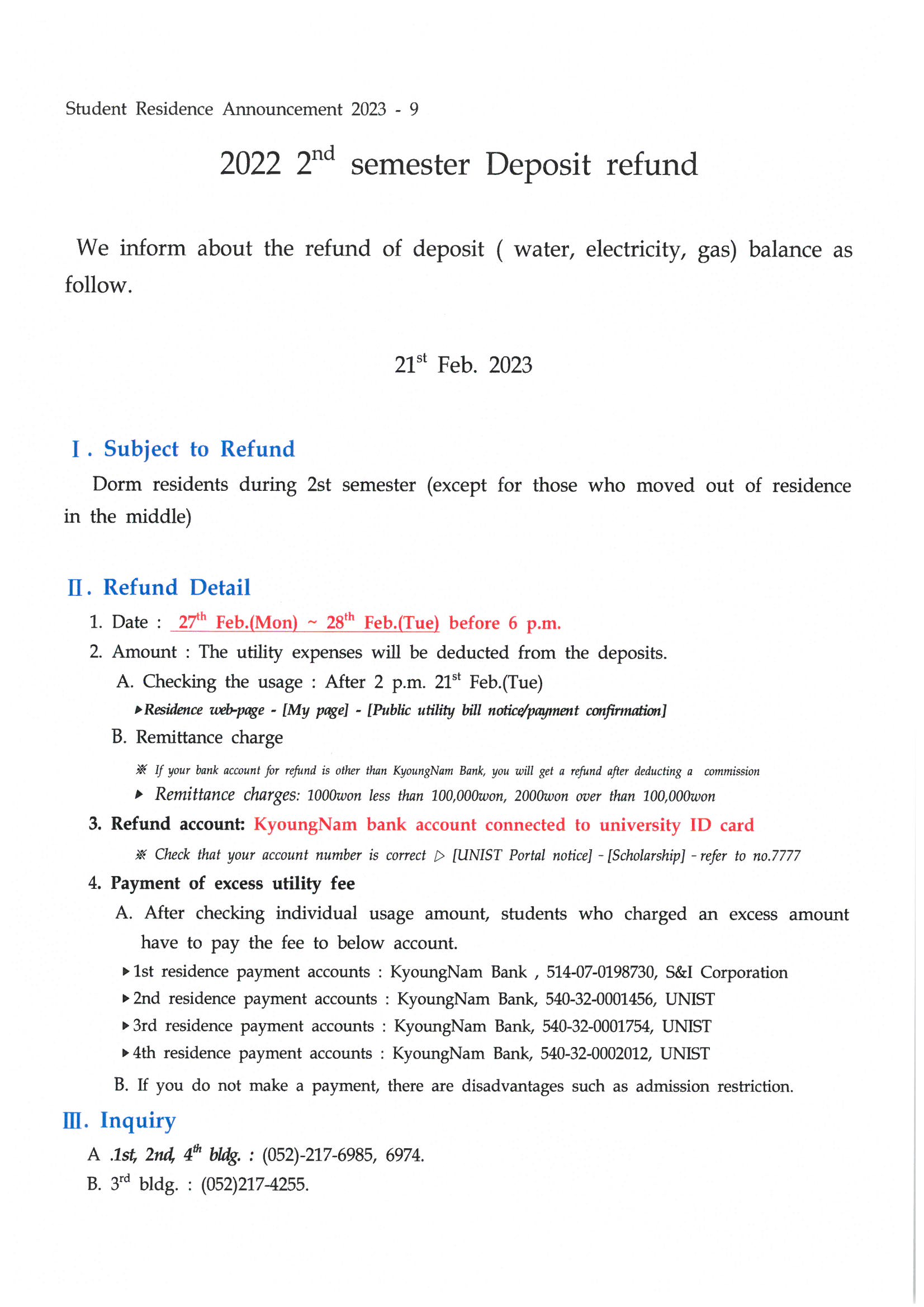 | 743 | [No.2023-9] 2022년 2학기 예치금 잔액환불 안내 Deposit R.. | 2023-02-21 | 2214 |