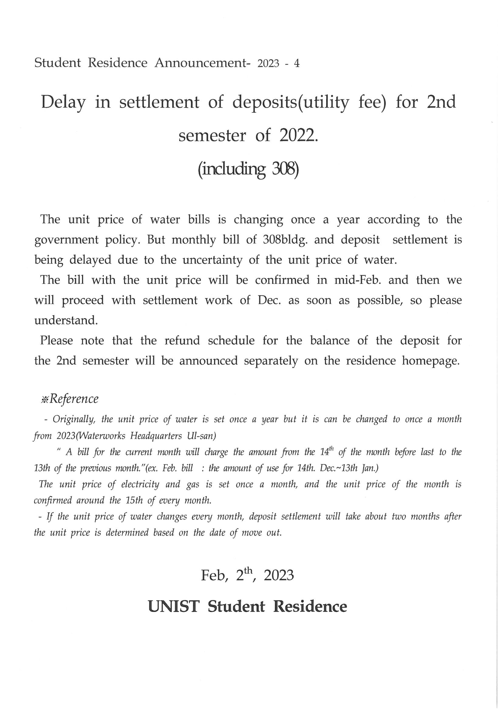 | 729 | [No.2023-4] 2022년 2학기 예치금(수도광열비) 12월 정산 지.. | 2023-02-02 | 2154 |