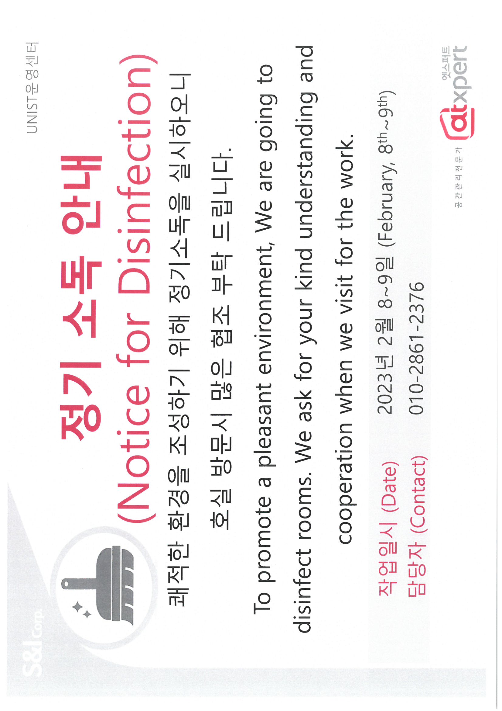 | 731 | 정기소독안내(Notice for Disinfection) | 2023-02-03 | 1166 |