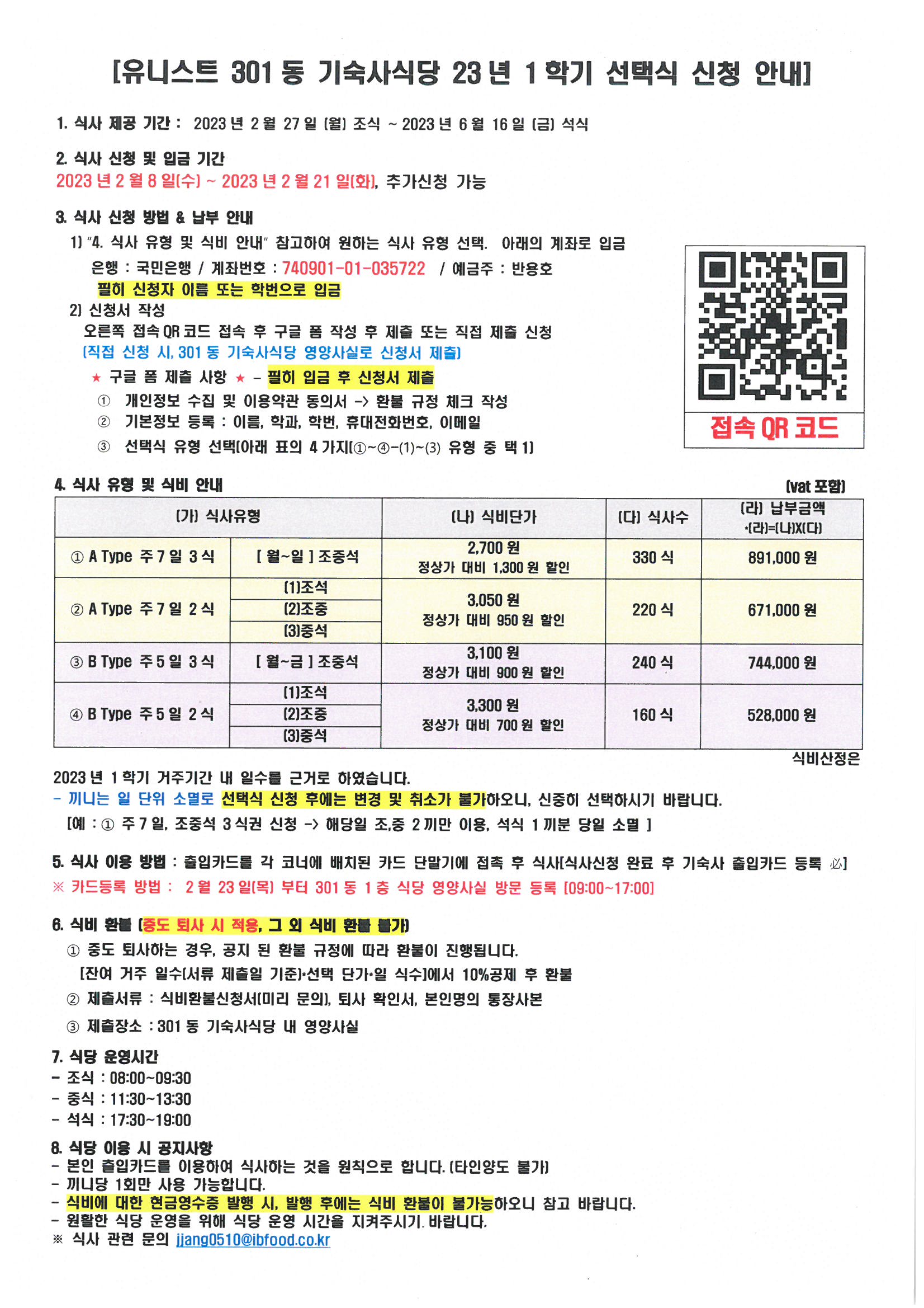 | 734 | 301동 기숙사 식당 1학기 선택식 신청 안내 | 2023-02-07 | 1764 |