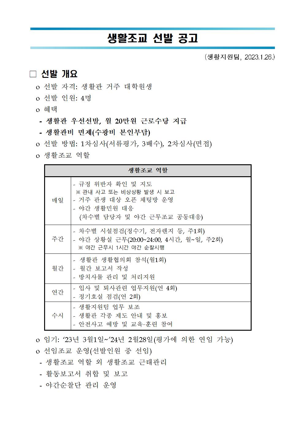 | 727 | 생활조교 선발 공고 | 2023-01-26 | 3106 |