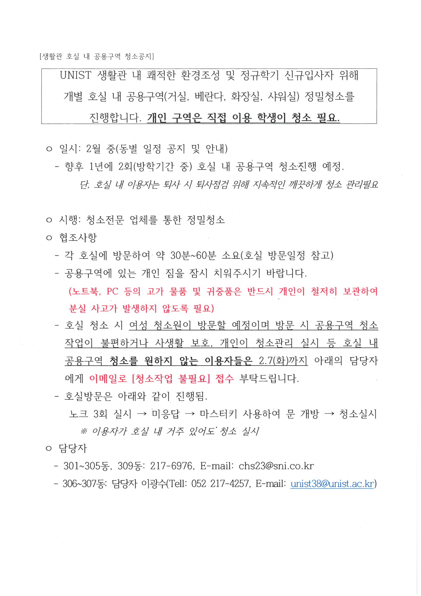 | 732 | (수정)공용구역청소공지(Cleaning for common area) | 2023-02-03 | 1870 |