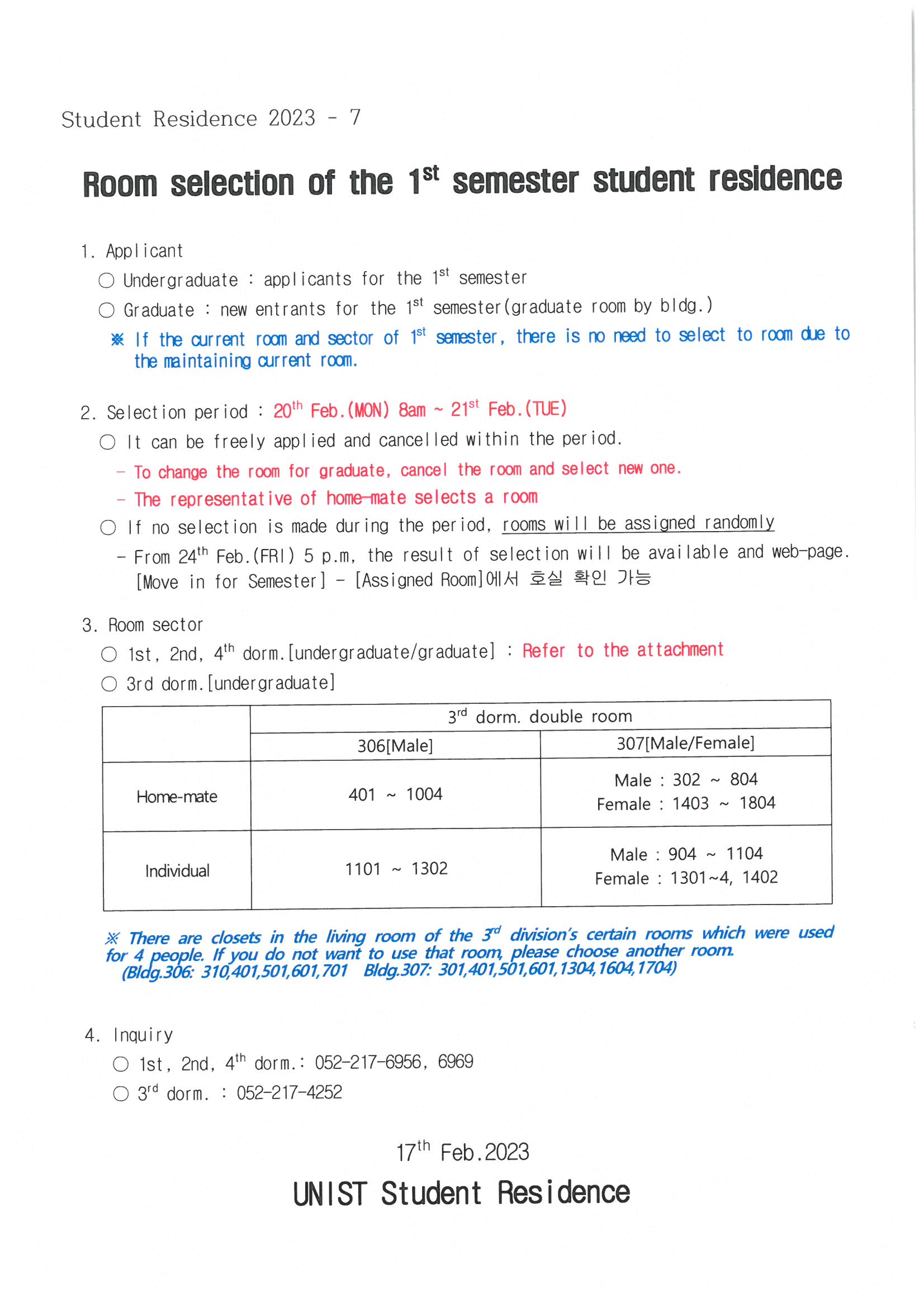 | 741 | [No.2023-7] 23년 1학기 생활관 신청 유형별 호실 섹터안내 .. | 2023-02-17 | 3234 |