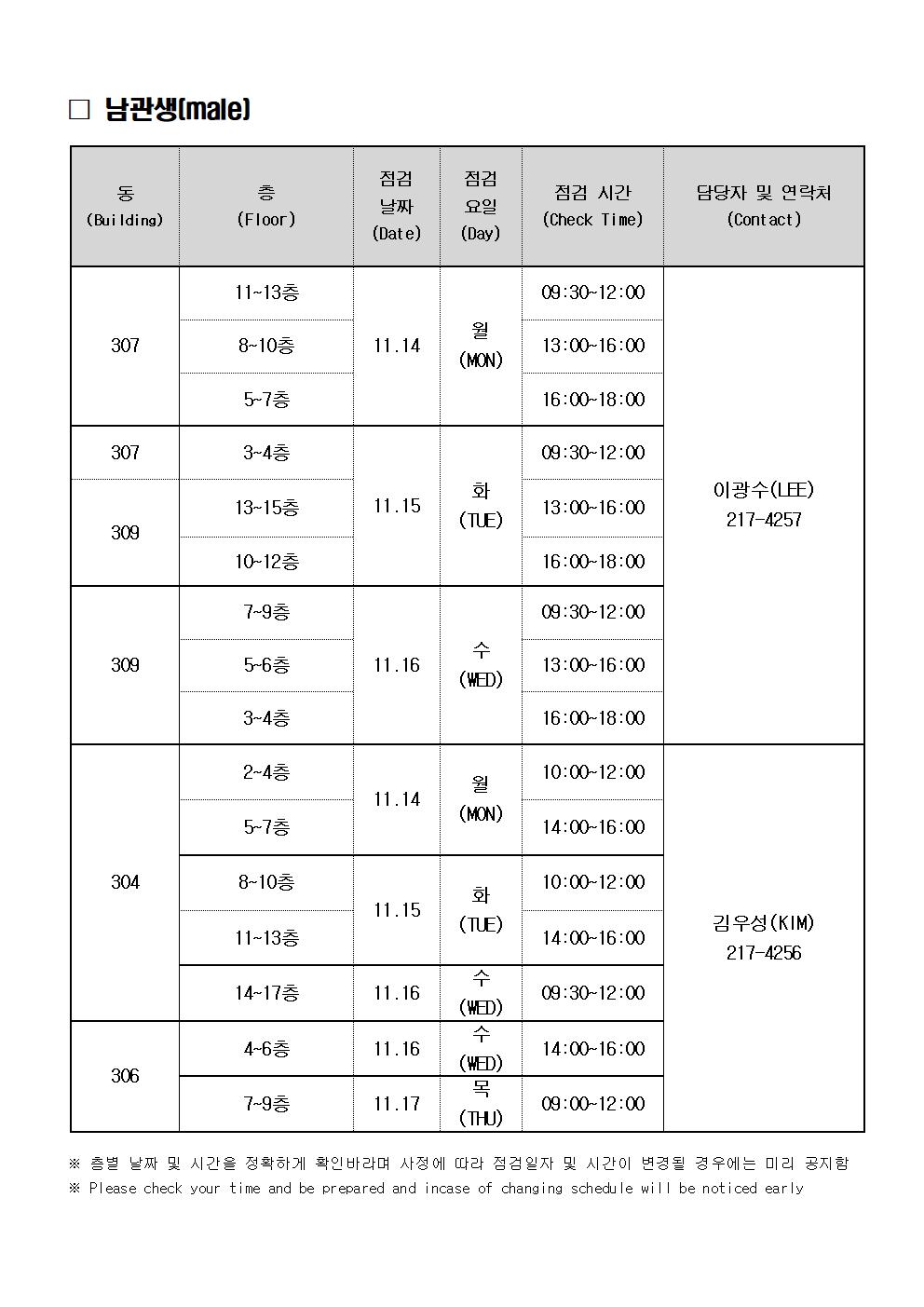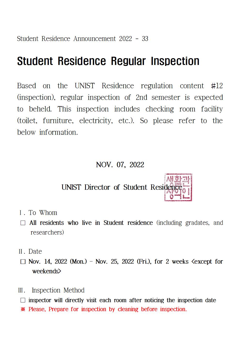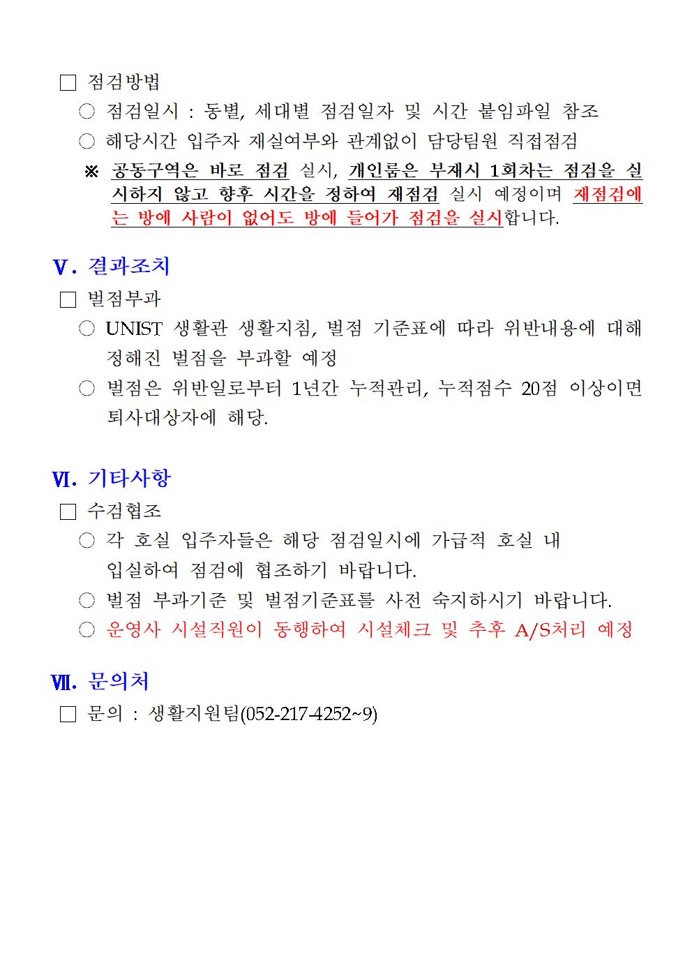 | 699 | (No.2022-33) 생활관 정기점검 및 시설점검 실시(Student Re.. | 2022-11-07 | 3957 |