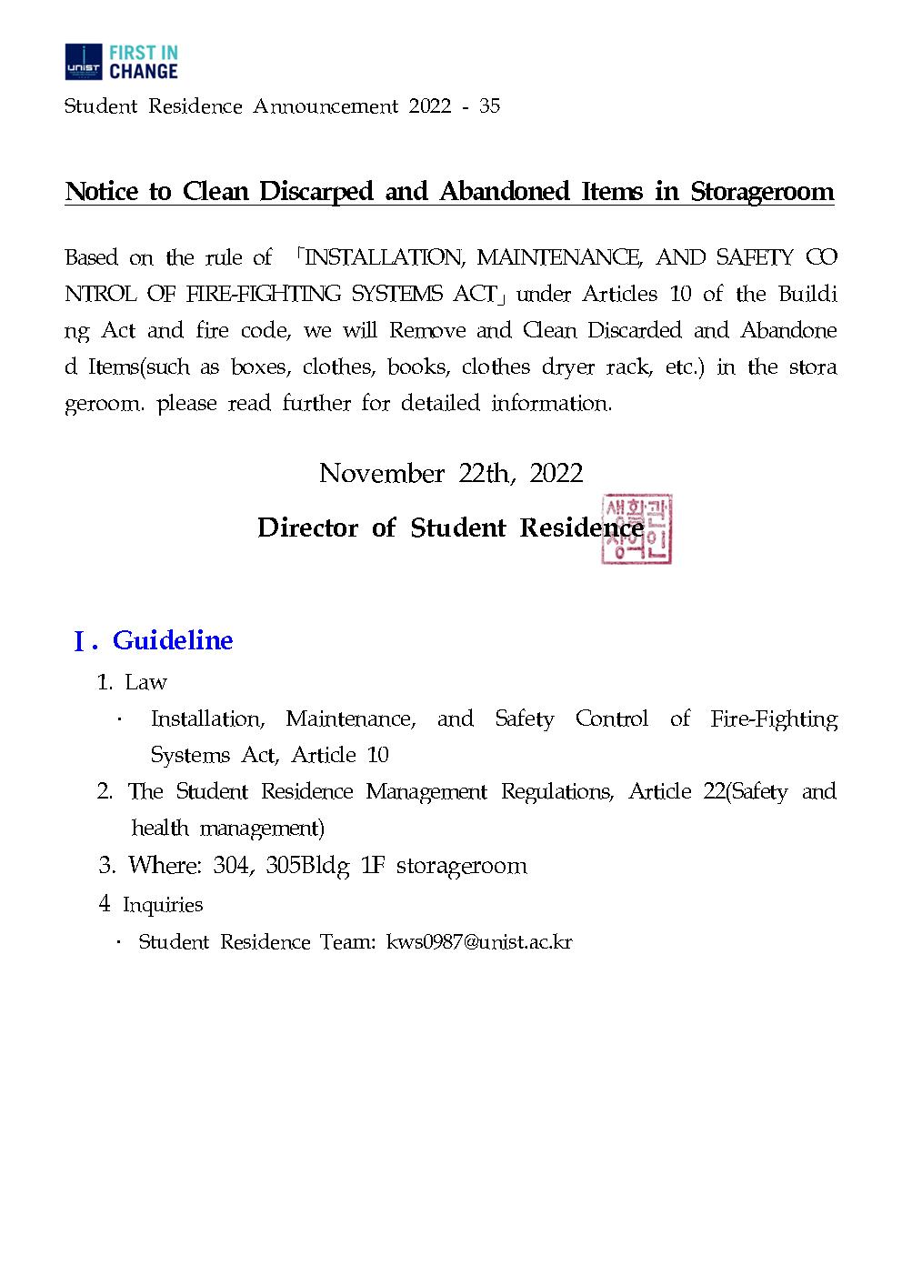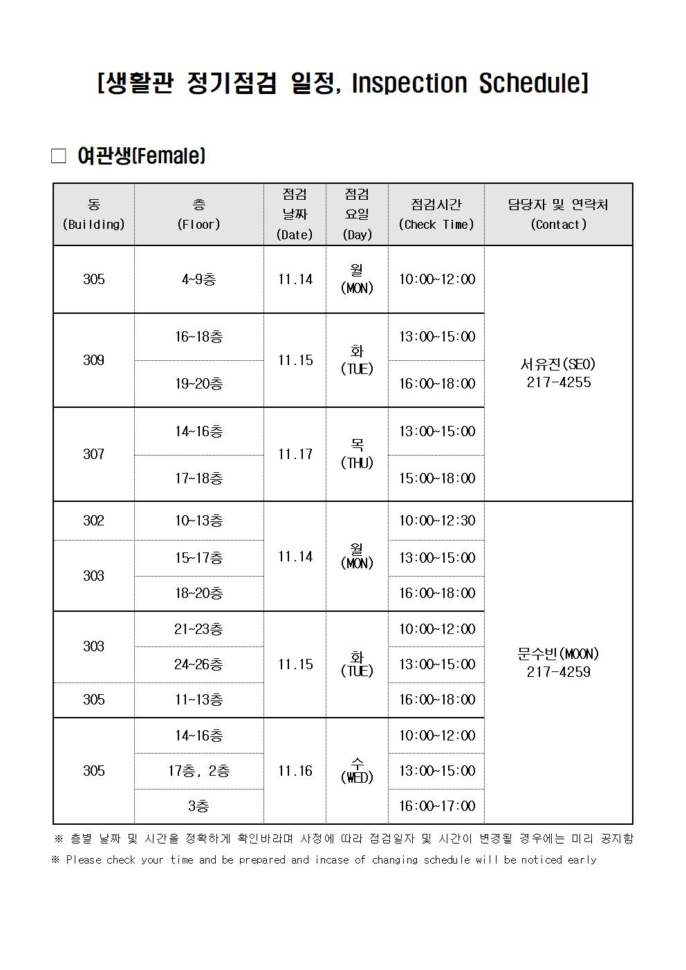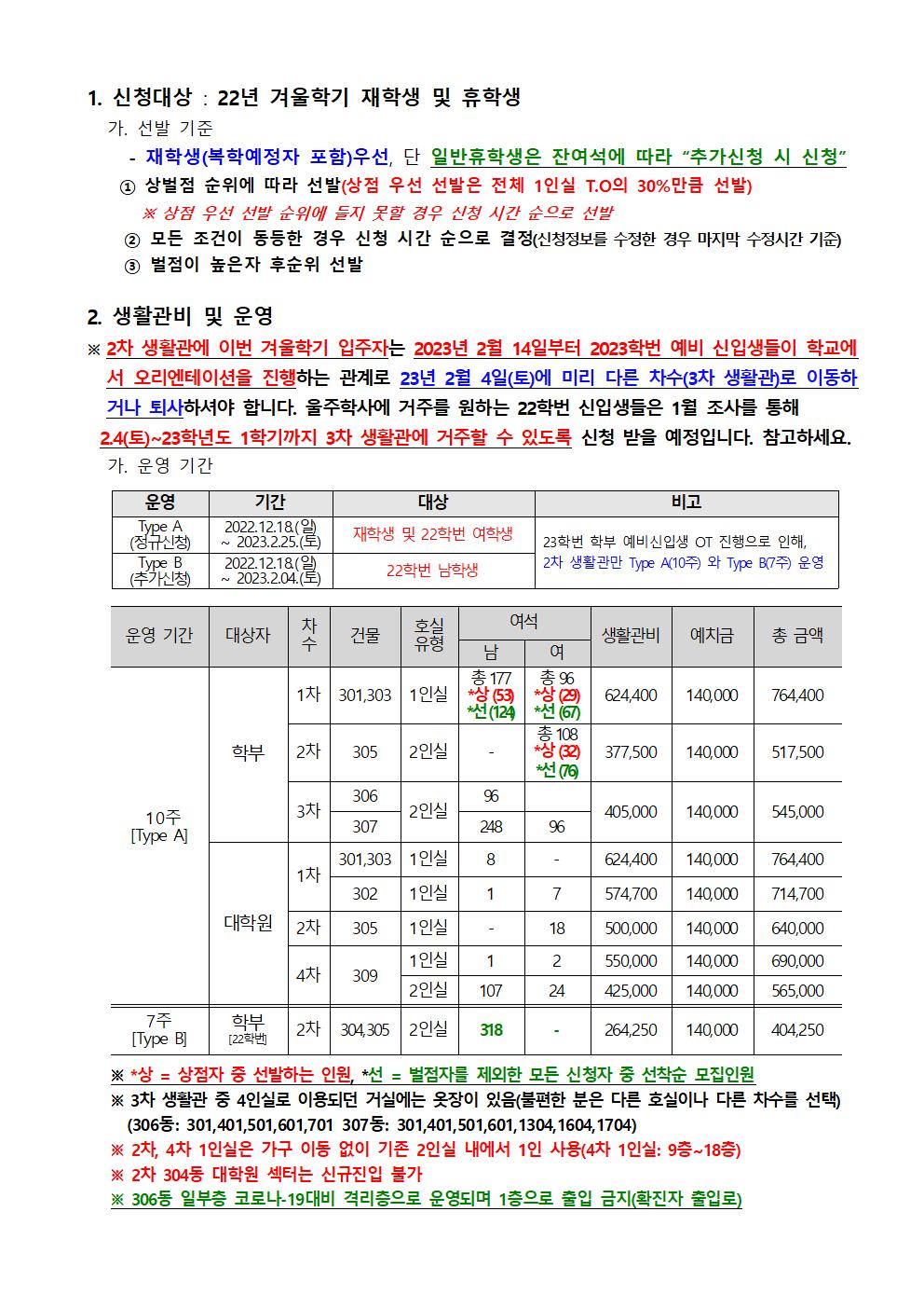| 699 | (No.2022-33) 생활관 정기점검 및 시설점검 실시(Student Re.. | 2022-11-07 | 3957 |
