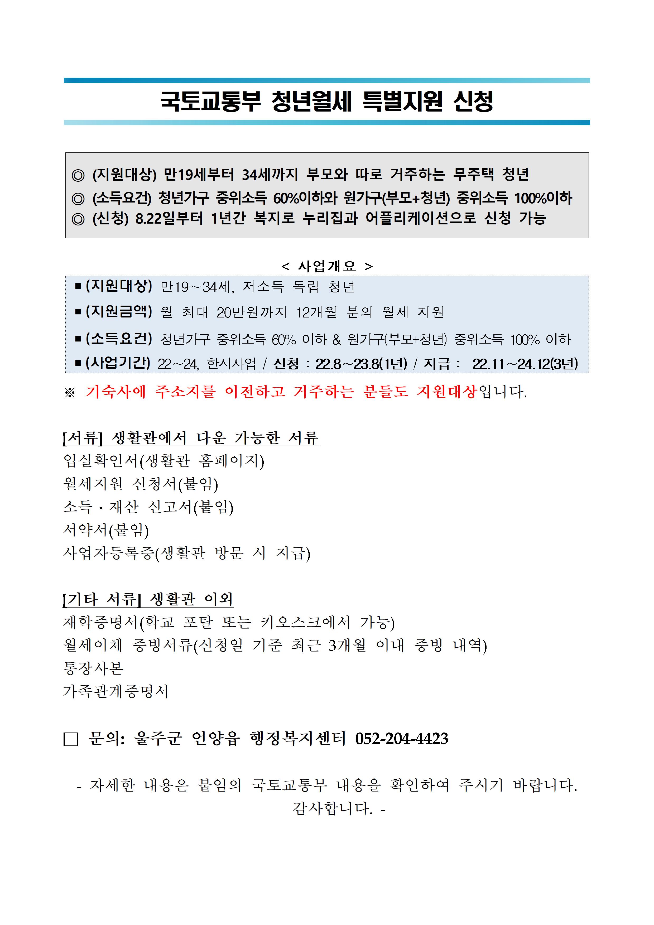| 696 | 청년월세 특별지원 (한시지원) 대상자 분들은 신청하세요. | 2022-10-24 | 3211 |