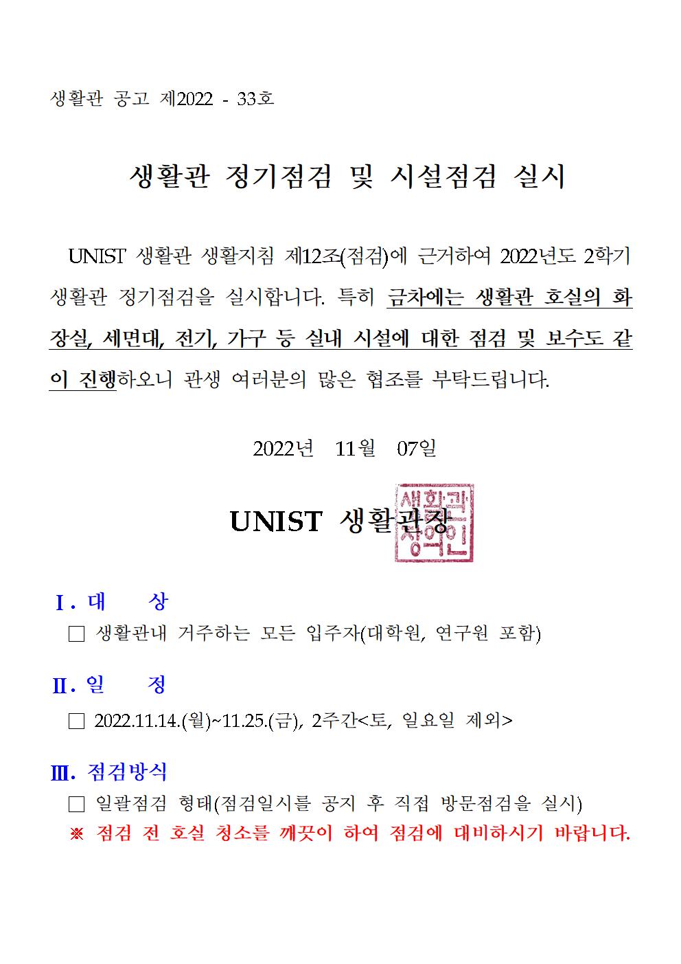 | 699 | (No.2022-33) 생활관 정기점검 및 시설점검 실시(Student Re.. | 2022-11-07 | 4000 |