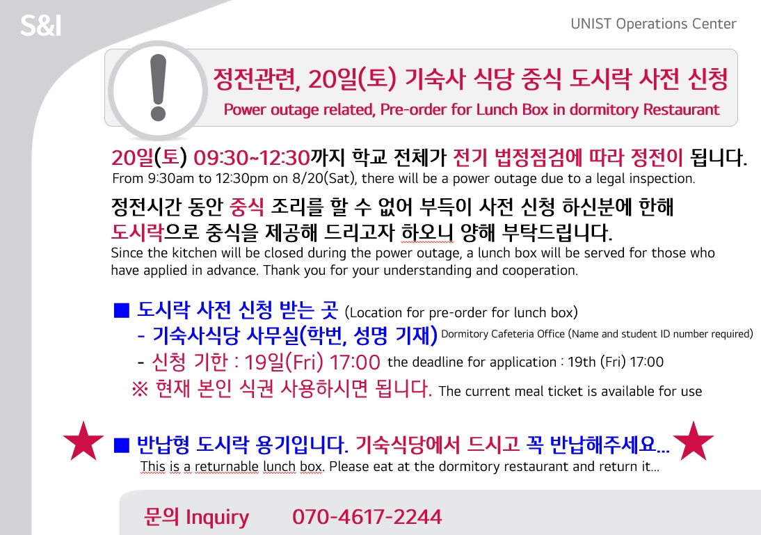 | 675 | 정전관련, 20(토) 기숙사 식당 중식 도시락 사전 신청안내/ .. | 2022-08-17 | 1273 |