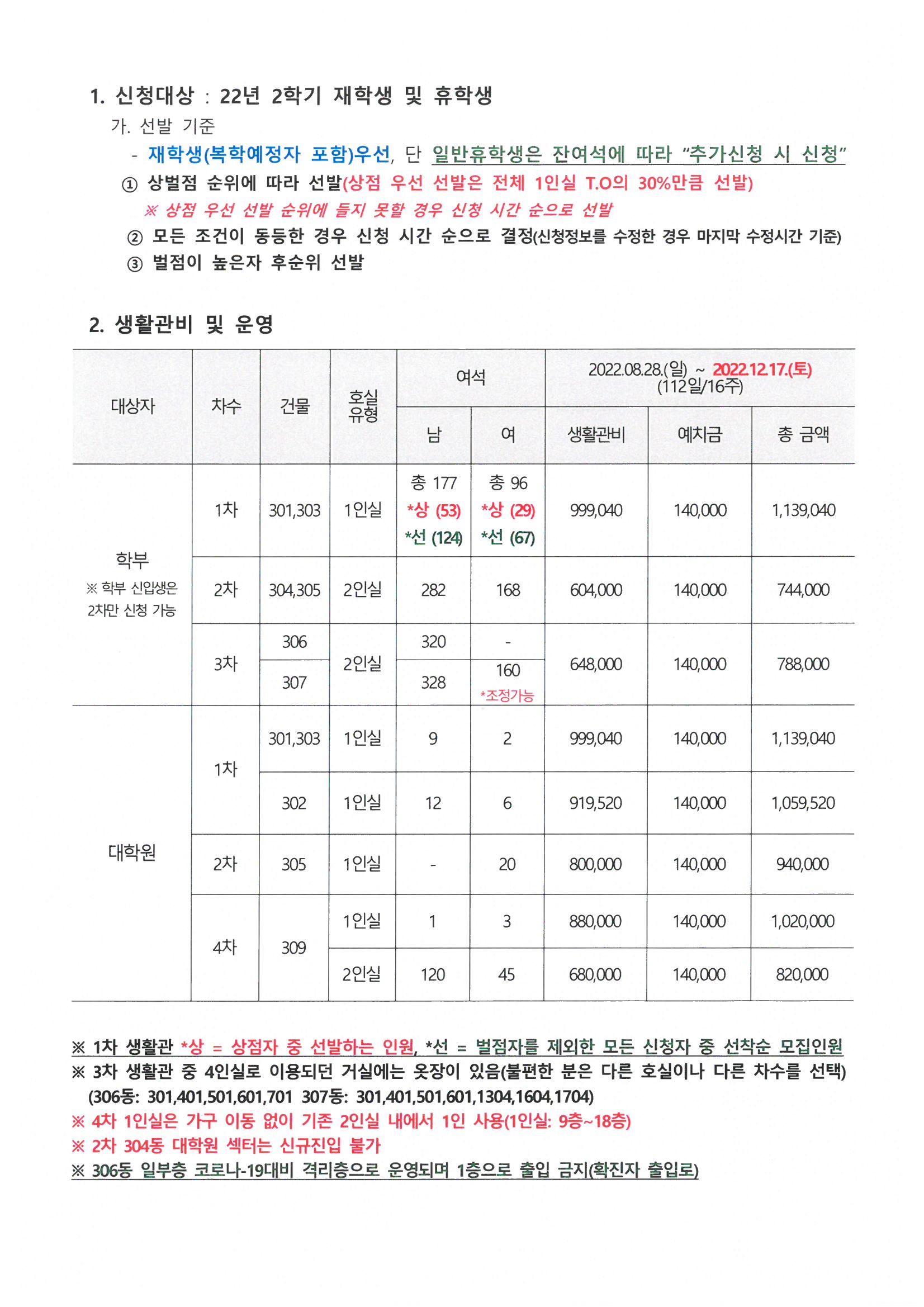 | 666 | (No.2022-23) 2022학년도 2학기 생활관 입사신청 안내 / app.. | 2022-07-12 | 12894 |