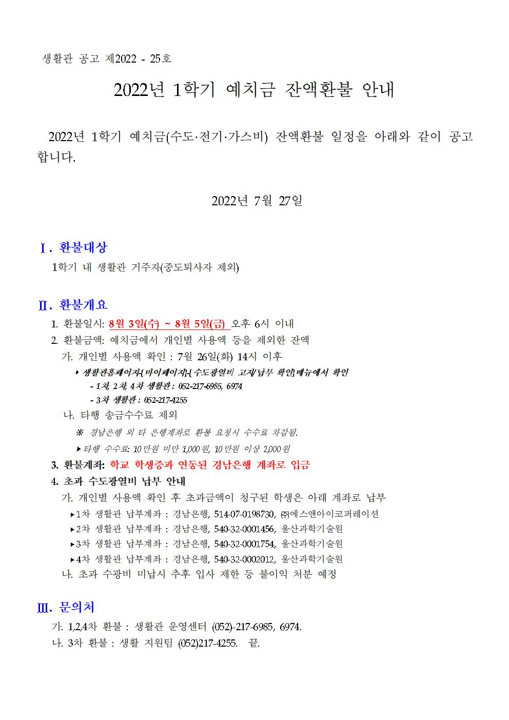 | 669 | (No.2022-25) 2022년 1학기 예치금 잔액환불 안내(2022 1st-.. | 2022-07-27 | 2841 |