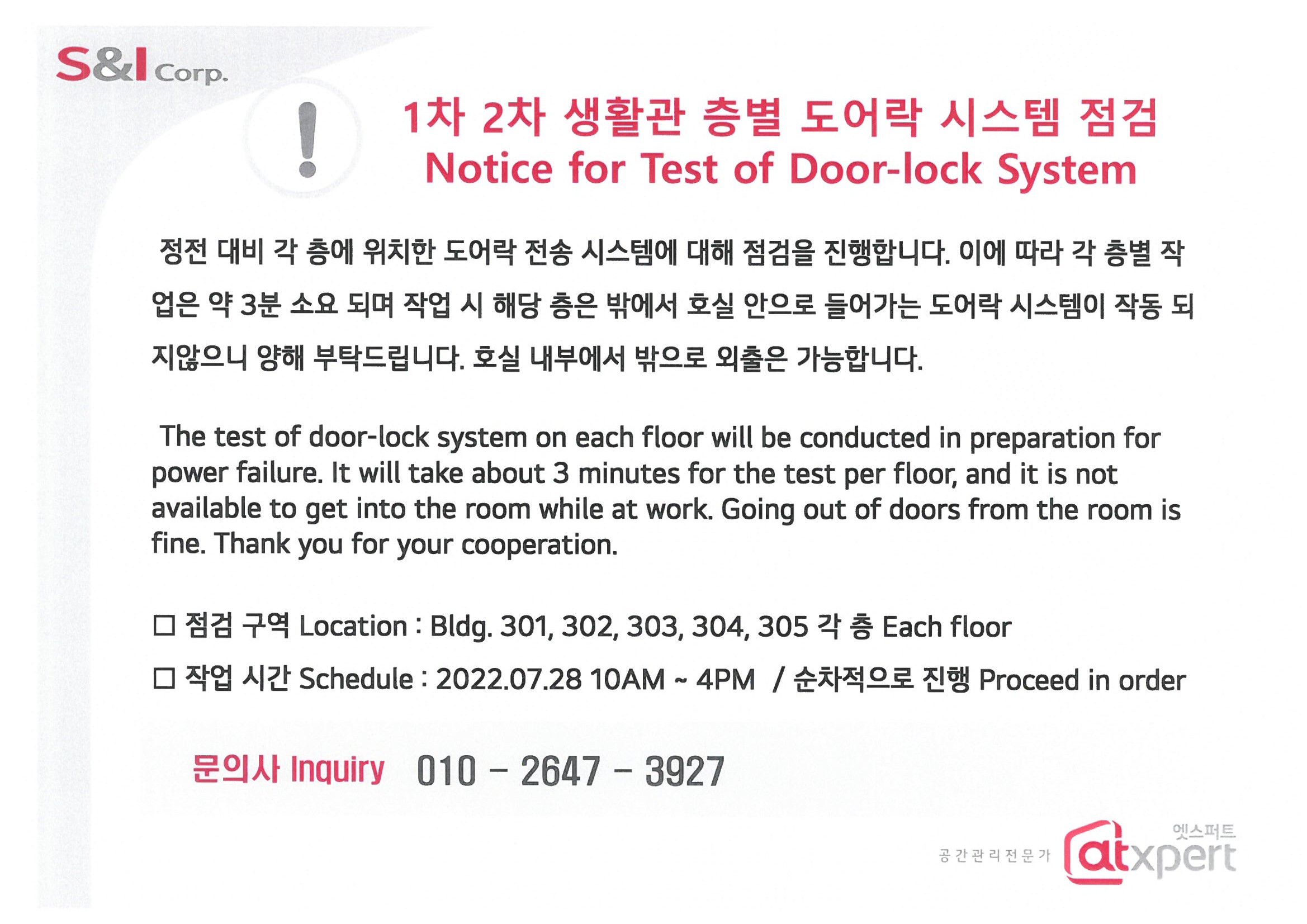 | 670 | 1차, 2차 생활관 층별 도어락 시스템 점검/ Notice for Test.. | 2022-07-27 | 1092 |