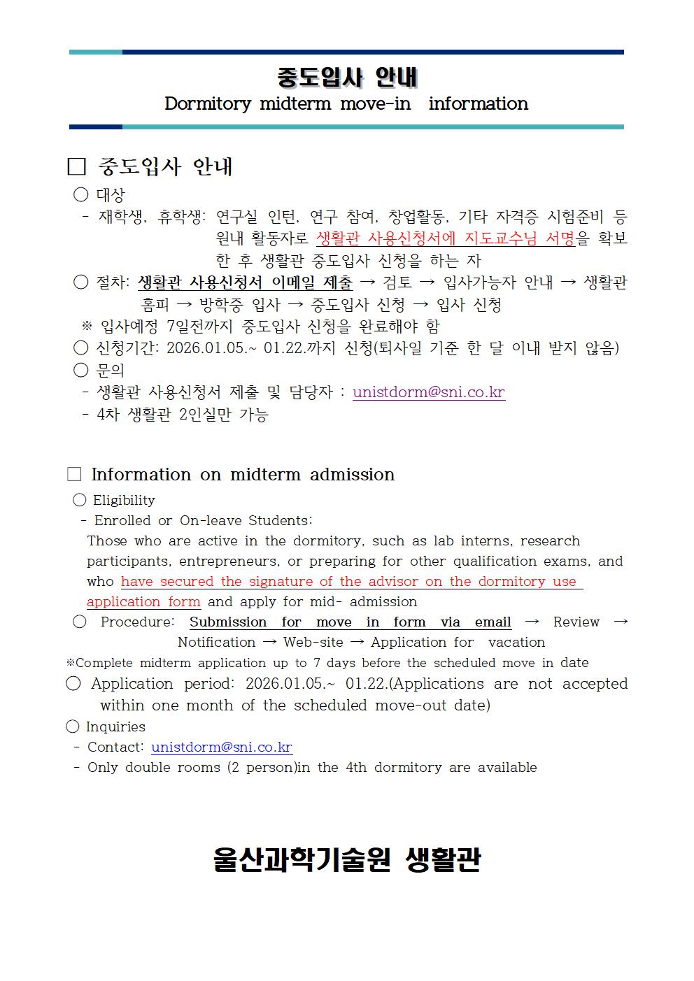 | 1076 | 방학중 중도입사 안내(Half-way application for dormitory .. | 2025-09-05 | 1378 |