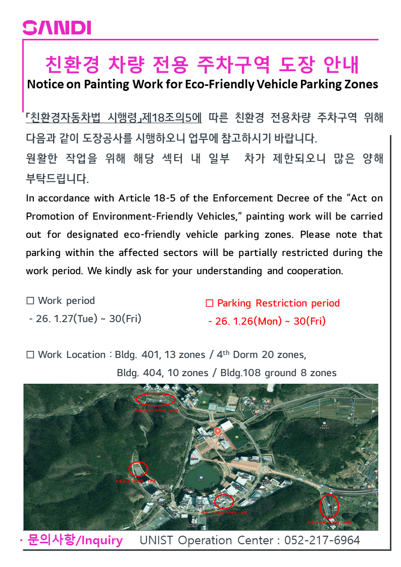 | 1078 | 친환경 차량 전용 주차구역 도장 안내/Notice on Painting W.. | 2026-01-19 | 339 |