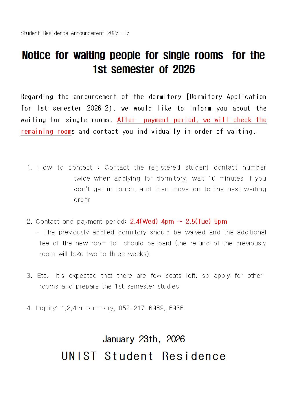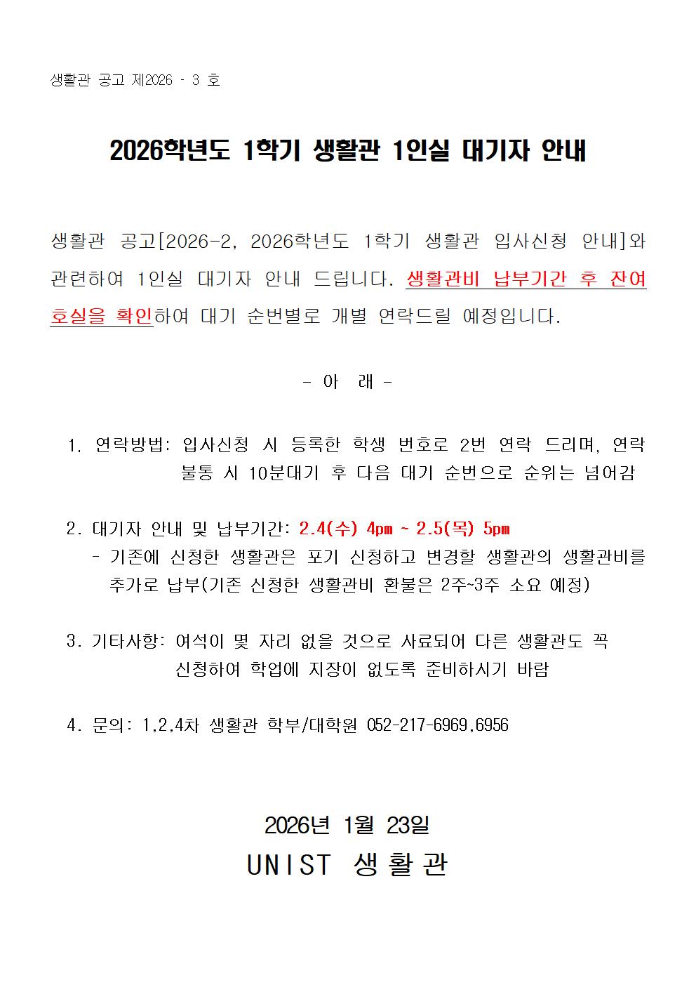 | 1079 | [No.2026-3] 2026학년도 1학기 생활관 1인실 대기자 안내(No.. | 2026-01-23 | 3498 |