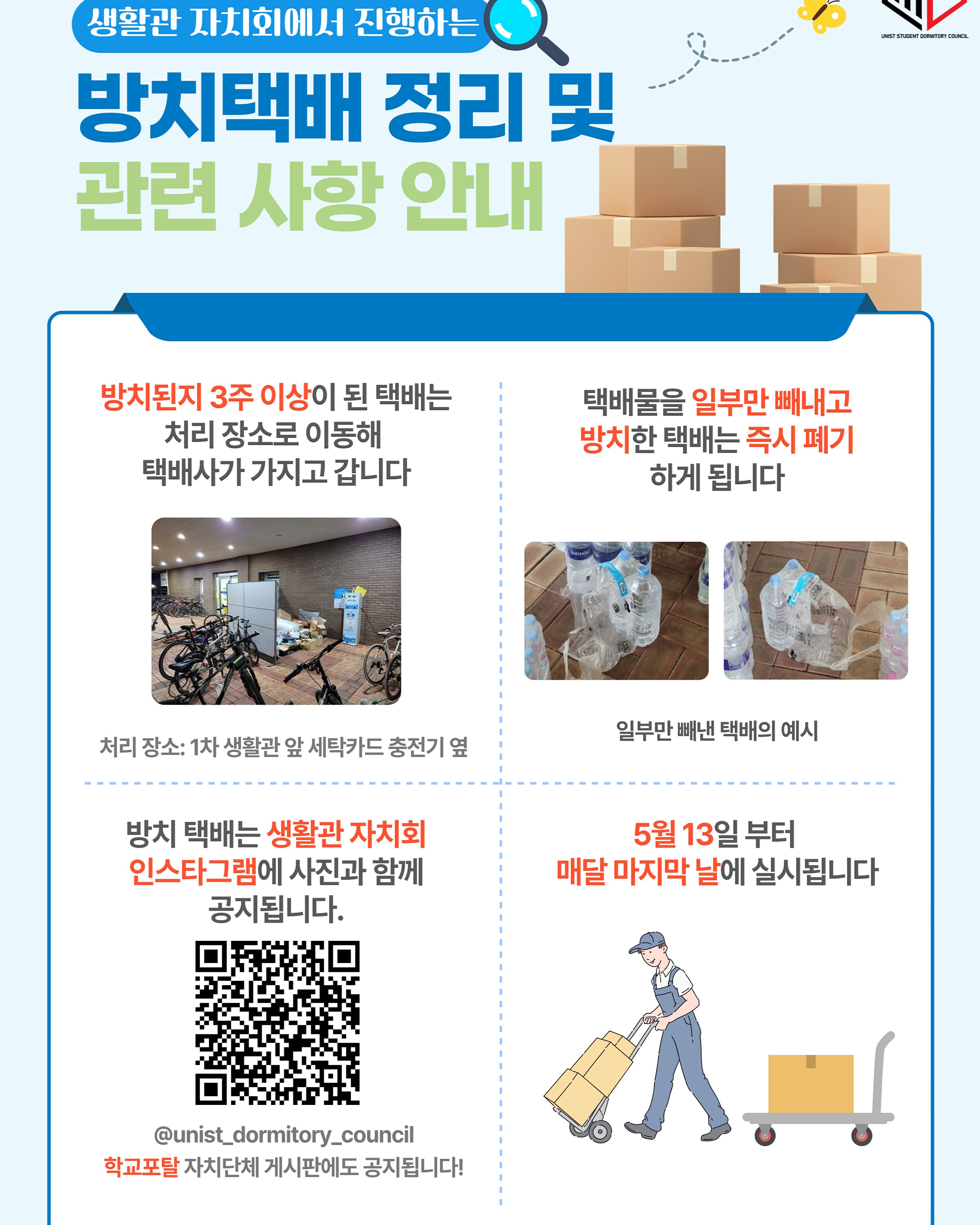 | 648 | 방치택배 정리 및 관련 사항 안내 | 2022-05-13 | 1772 |
