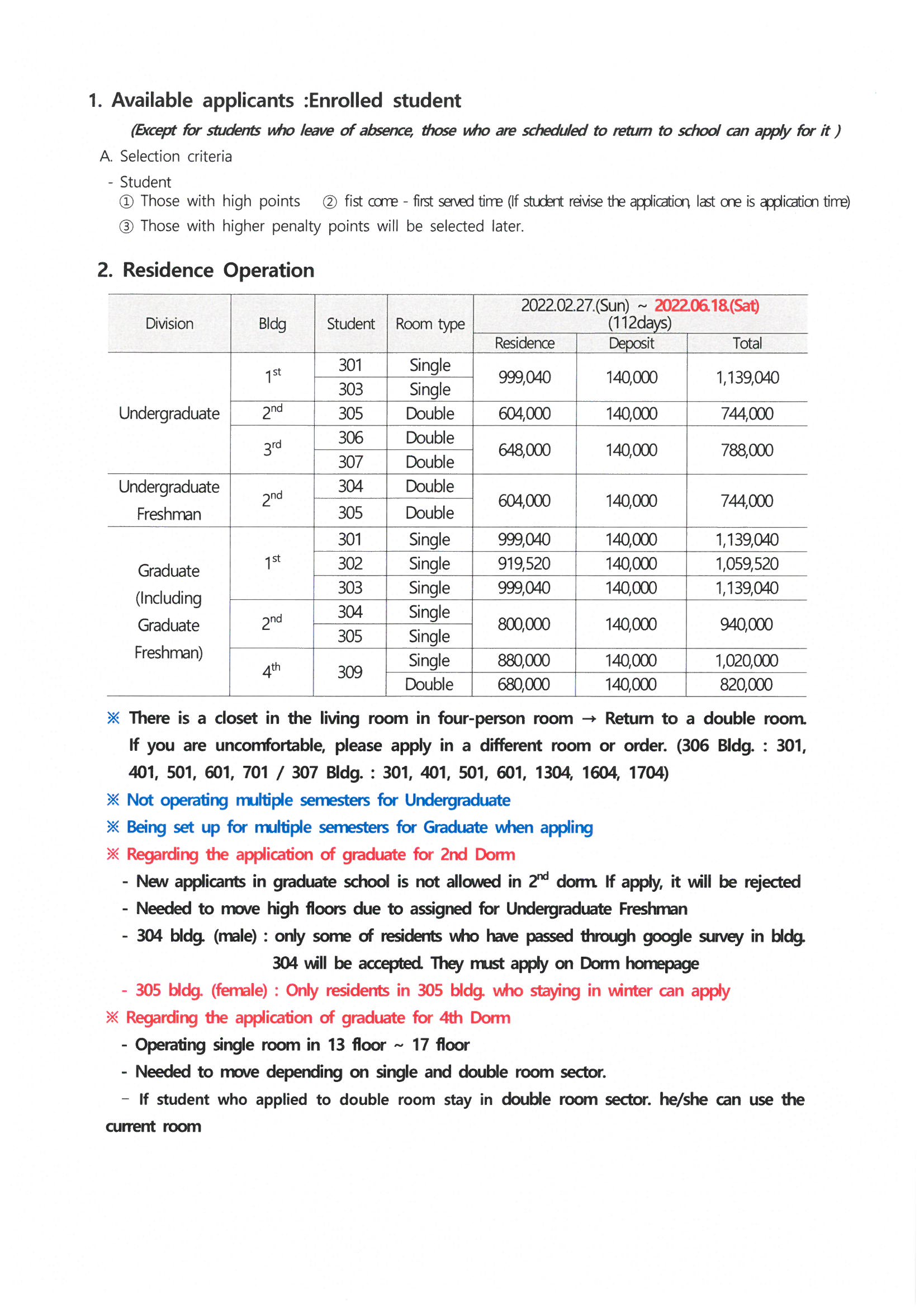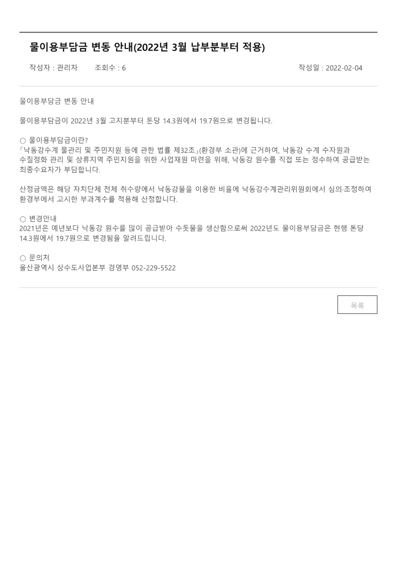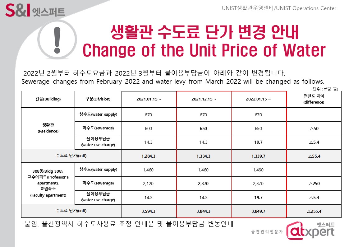 | 608 | 생활관 수도료 단가 변경 안내(Change of the Unit Price of.. | 2022-02-08 | 2136 |